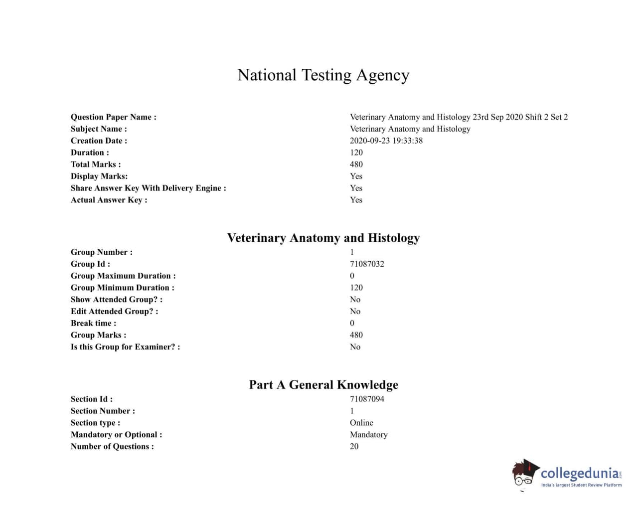 ICAR AIEEA 2020 JRF - VETERINARY ANATOMY AND HISTOLOGY Question paper with answer key pdf conducted on September 23, 2020 in Afternoon Session is available for download. The exam was successfully organized by National Testing Agency (NTA). The question paper comprised a total of 120 questions.