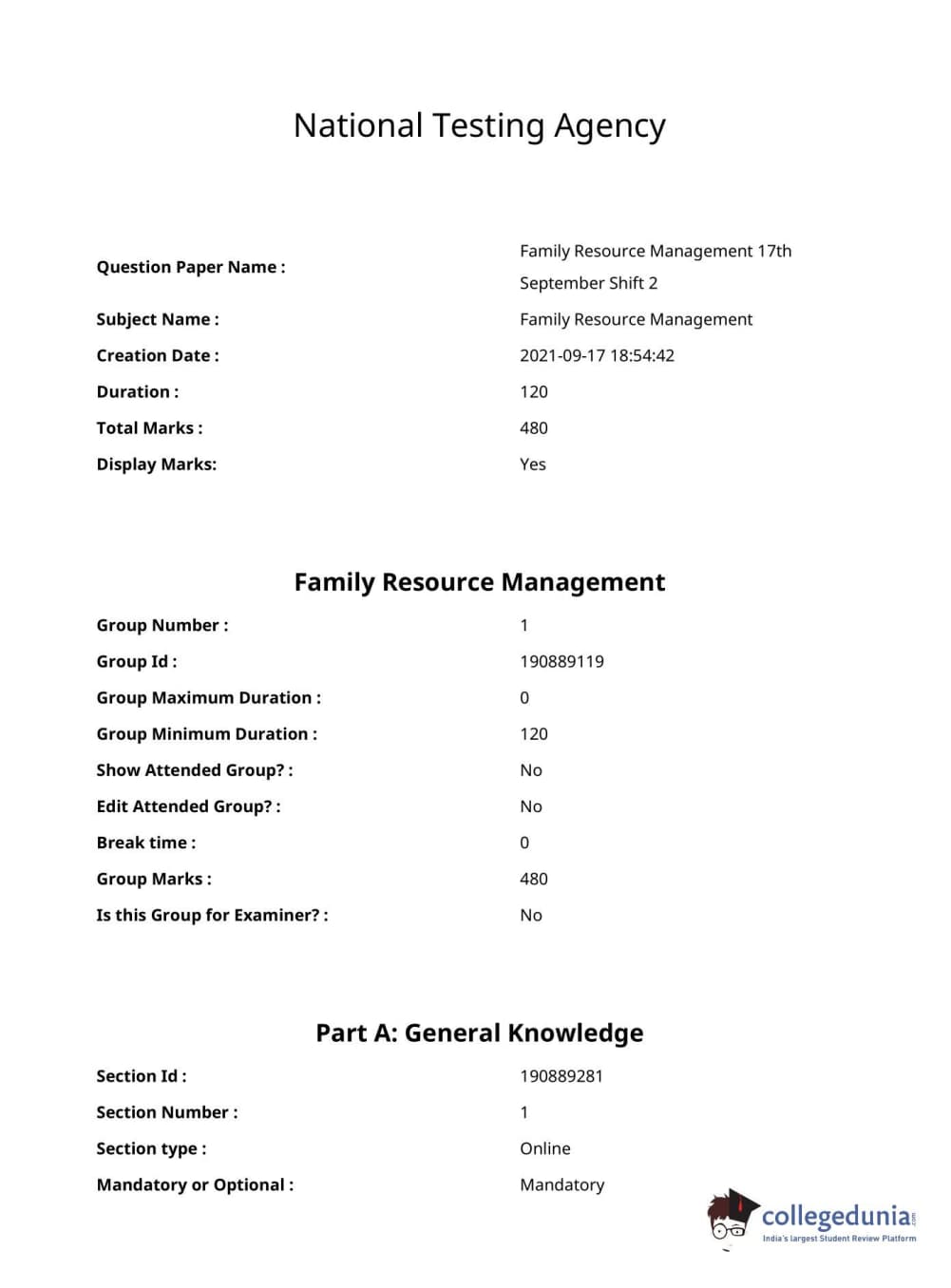 ICAR AIEEA 2021 JRF - FAMILY RESOURCE MANAGEMENT Question paper with answer key pdf conducted on September 17, 2021 in Afternoon Session is available for download. The exam was successfully organized by National Testing Agency (NTA). The question paper comprised a total of 120 questions.