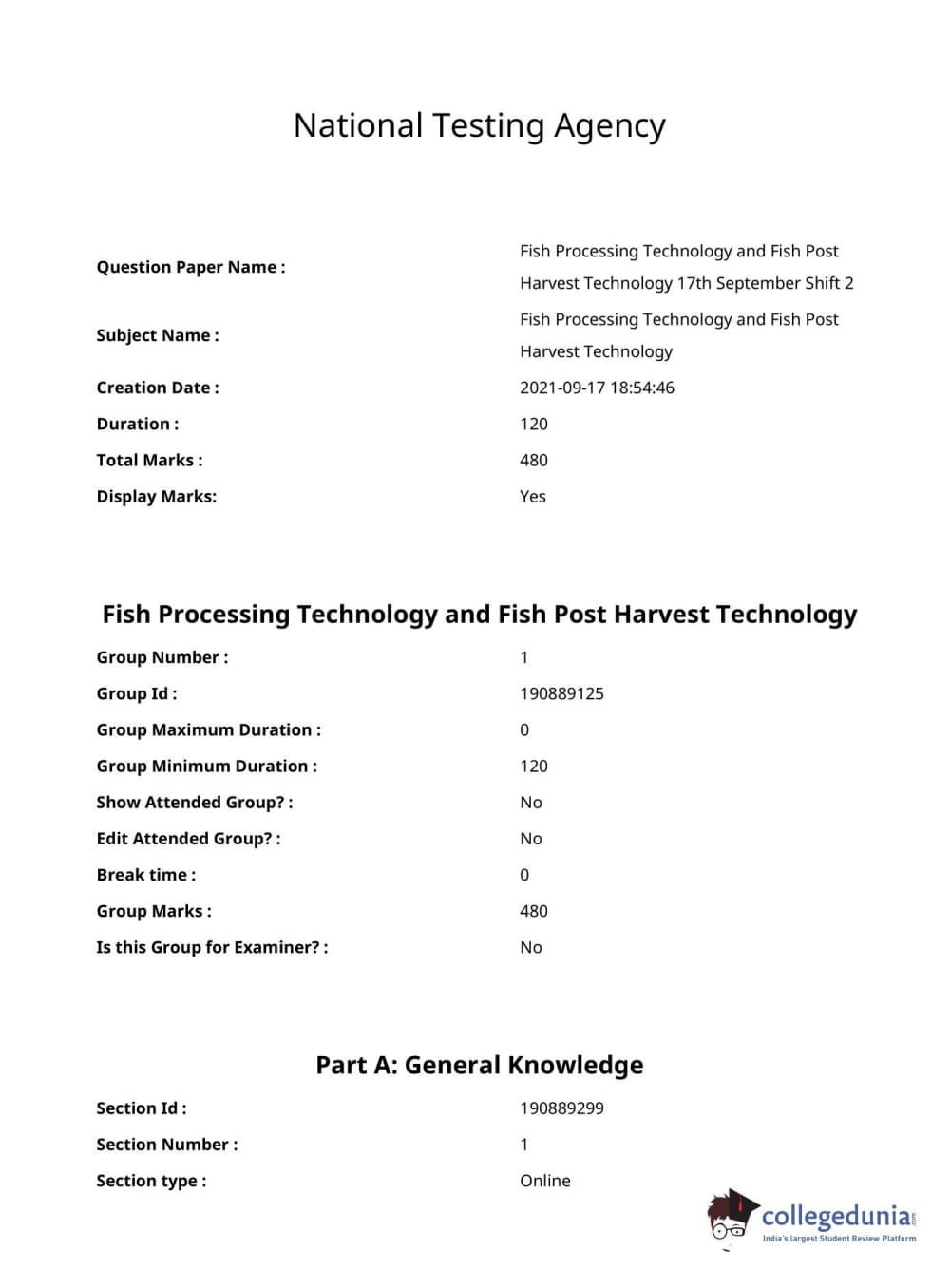 ICAR AIEEA 2021 JRF - FISH PROCESSING TECHNOLOGY AND FISH POST HARVEST TECHNOLOGY Question paper with answer key pdf conducted on September 17, 2021 in Afternoon Session is available for download. The exam was successfully organized by National Testing Agency (NTA). The question paper comprised a total of 120 questions.