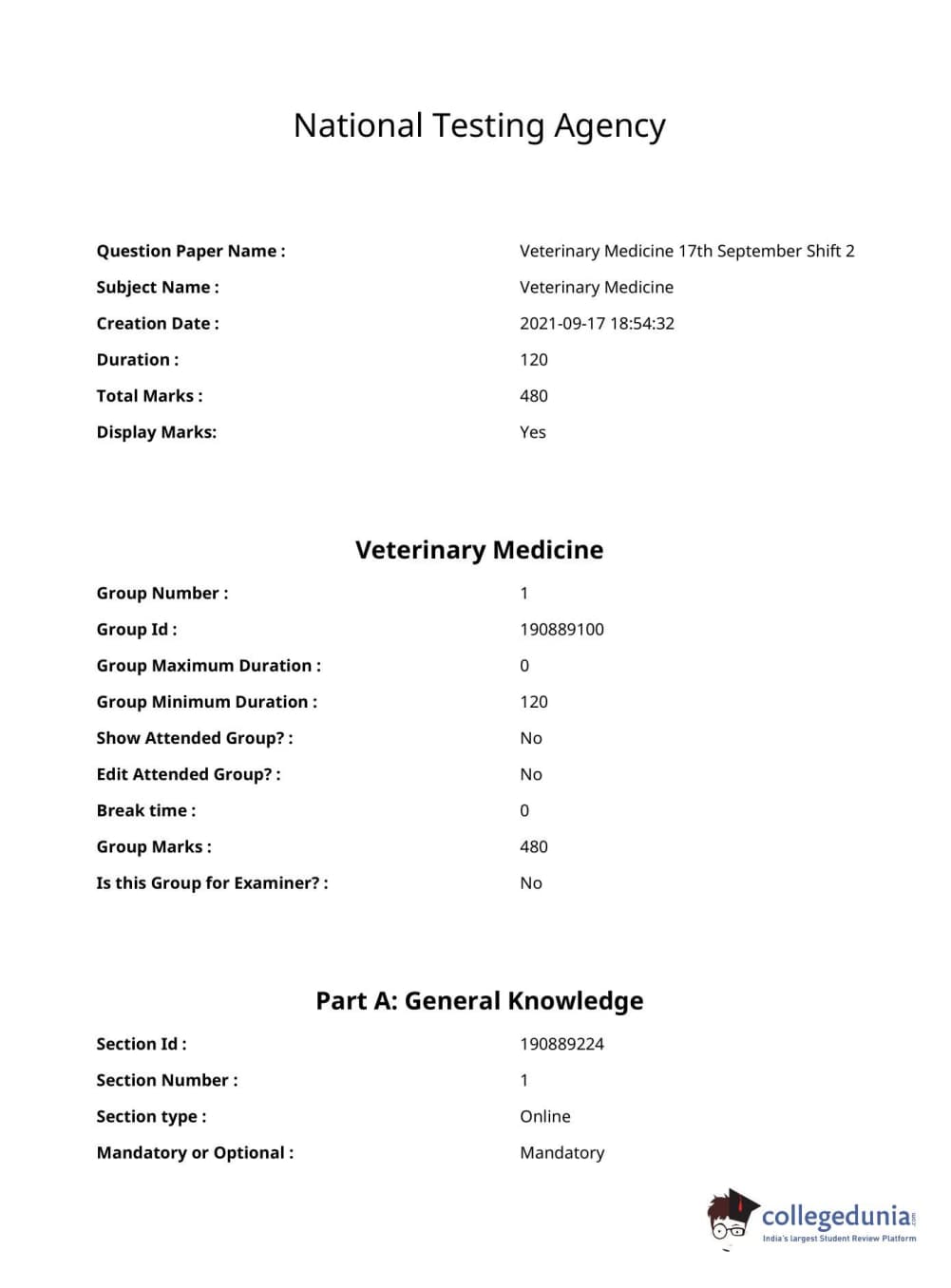 ICAR AIEEA 2021 JRF - VETERINARY MEDICINE Question paper with answer key pdf conducted on September 17, 2021 in Afternoon Session is available for download. The exam was successfully organized by National Testing Agency (NTA). The question paper comprised a total of 120 questions.