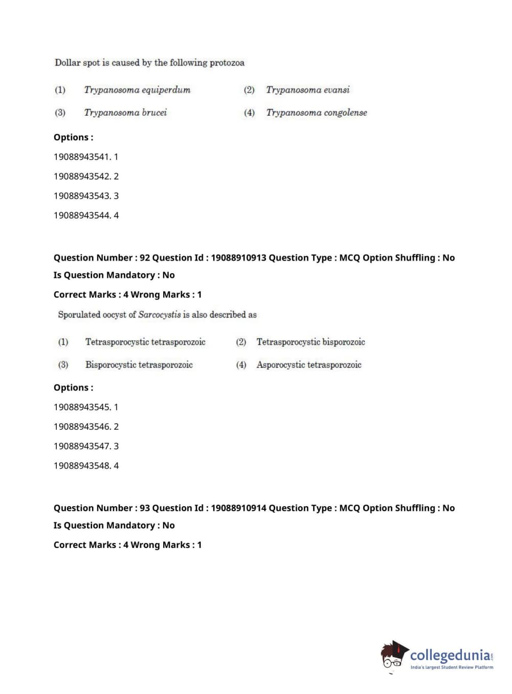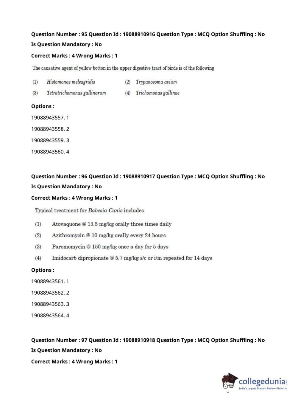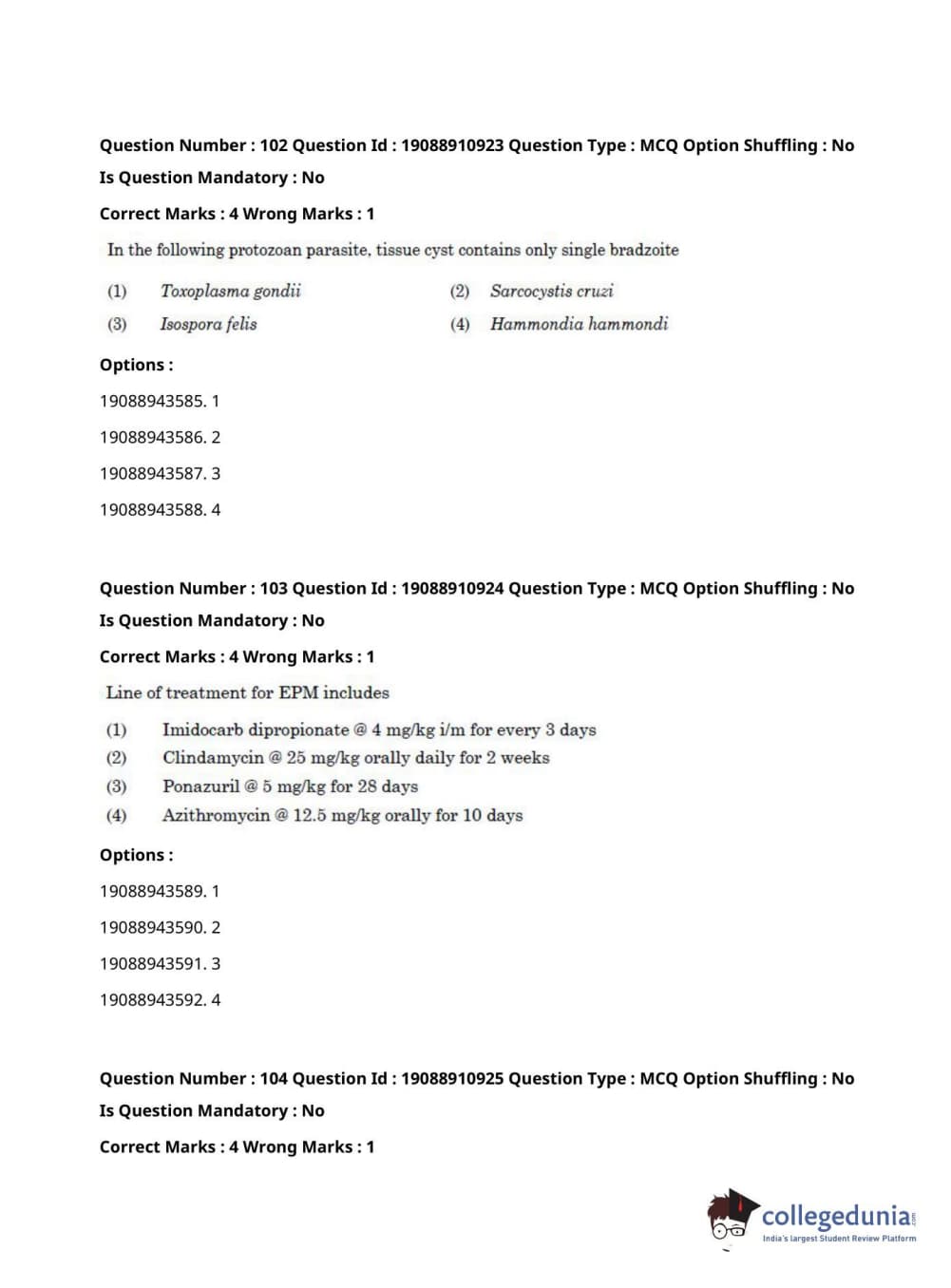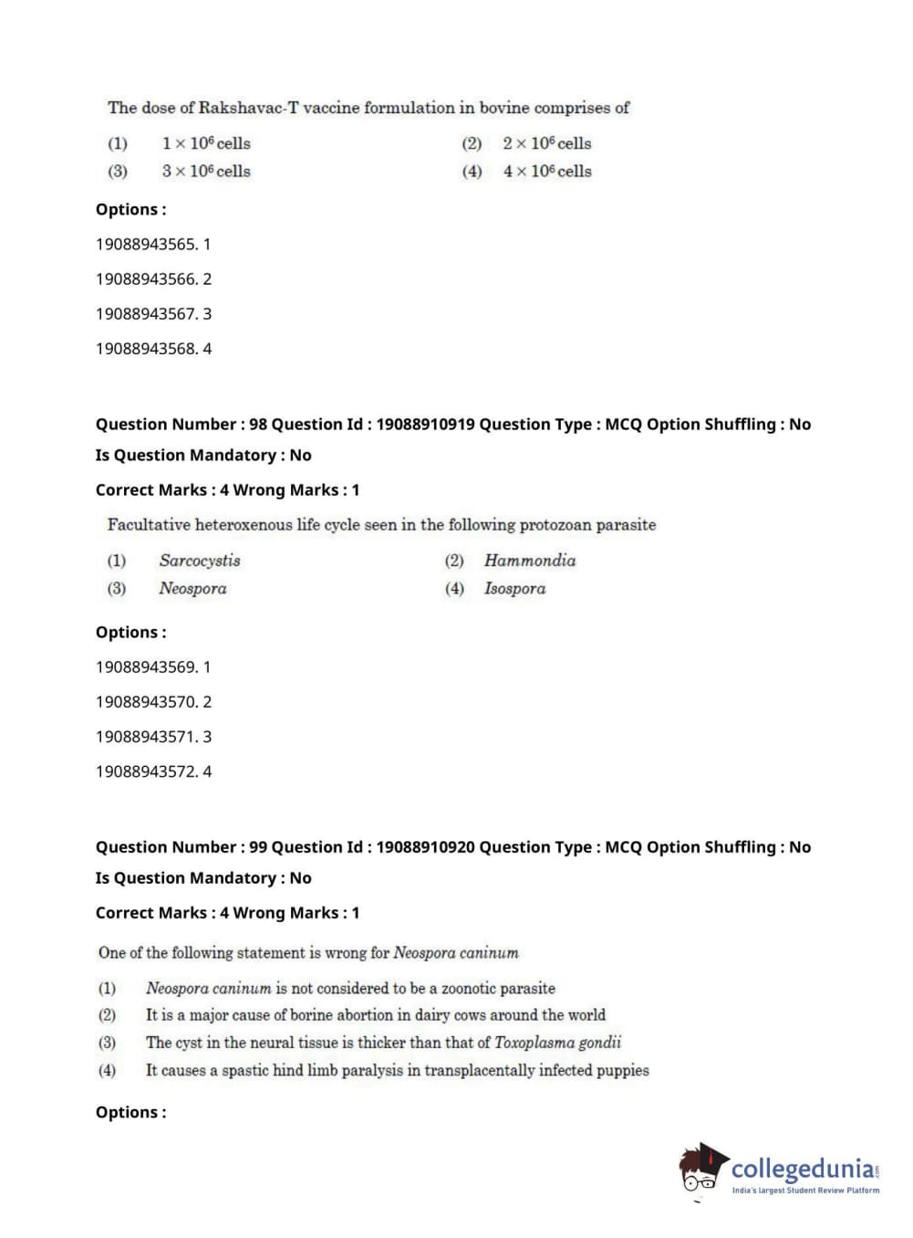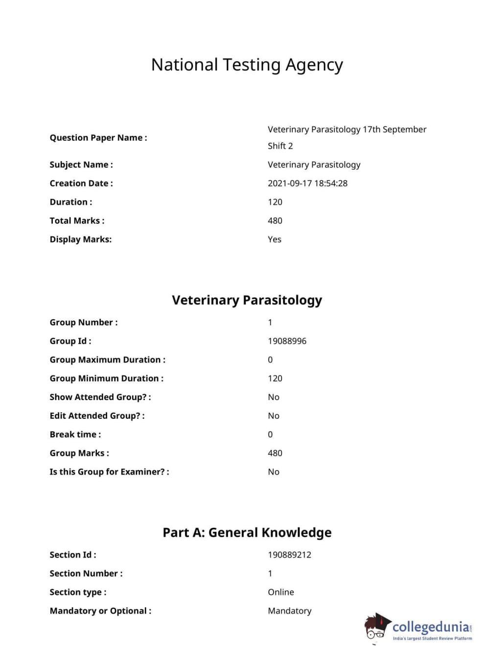 ICAR AIEEA 2021 JRF - VETERINARY PARASITOLOGY Question paper with answer key pdf conducted on September 17, 2021 in Afternoon Session is available for download. The exam was successfully organized by National Testing Agency (NTA). The question paper comprised a total of 120 questions.