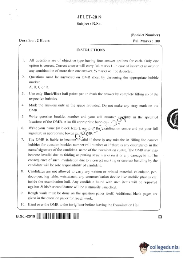 JELET 2019 BSc Question paper with answer key pdf conducted on July 14, 2019 is available for download. The exam was successfully organized by WBJEEB. The question paper comprised a total of 100 questions.