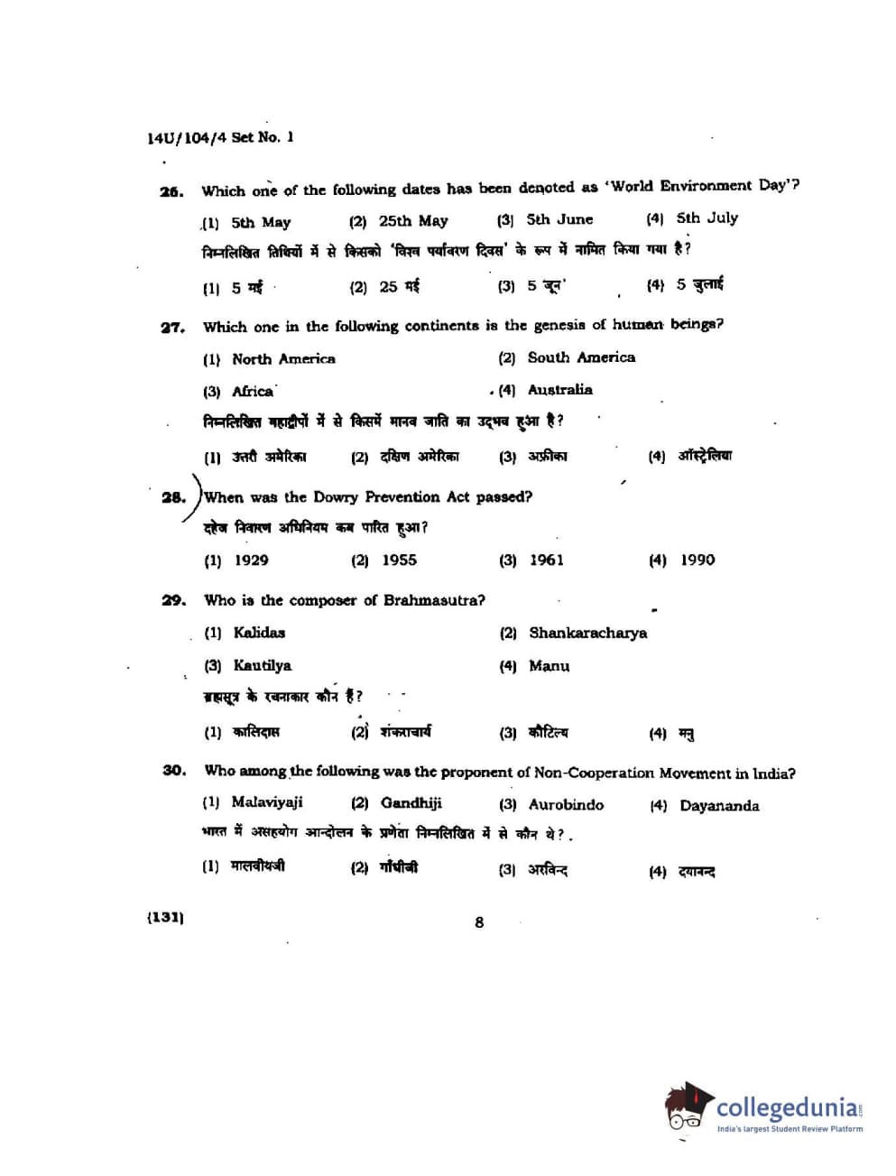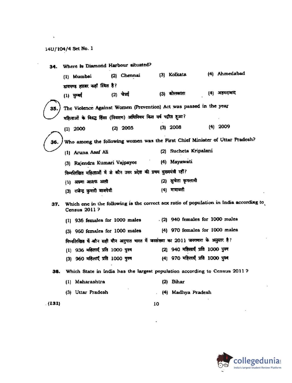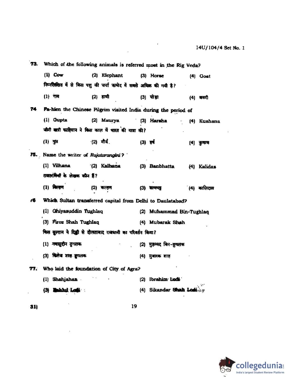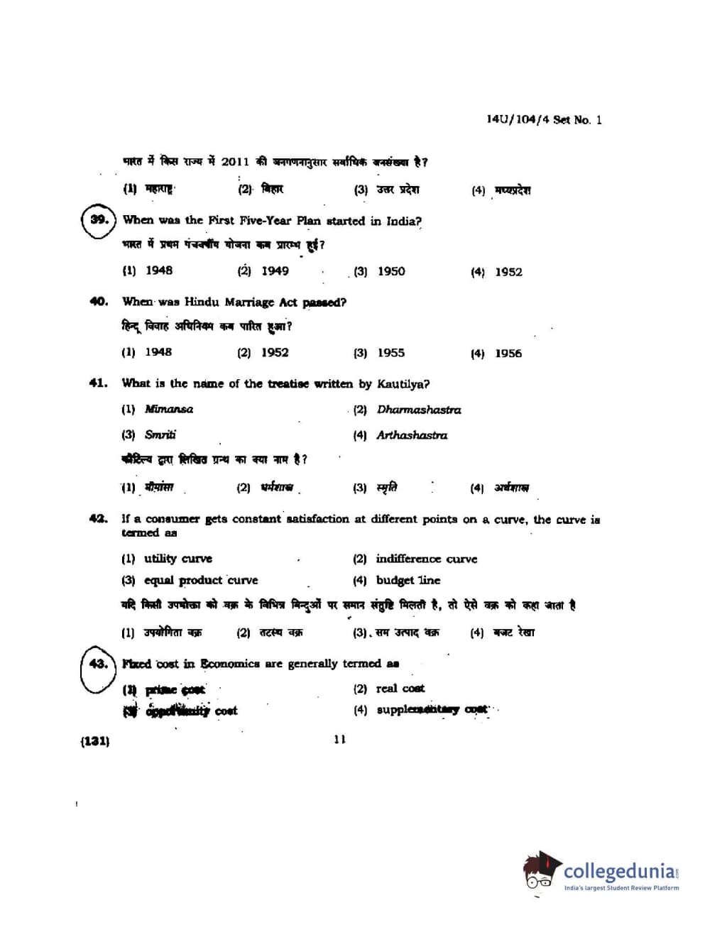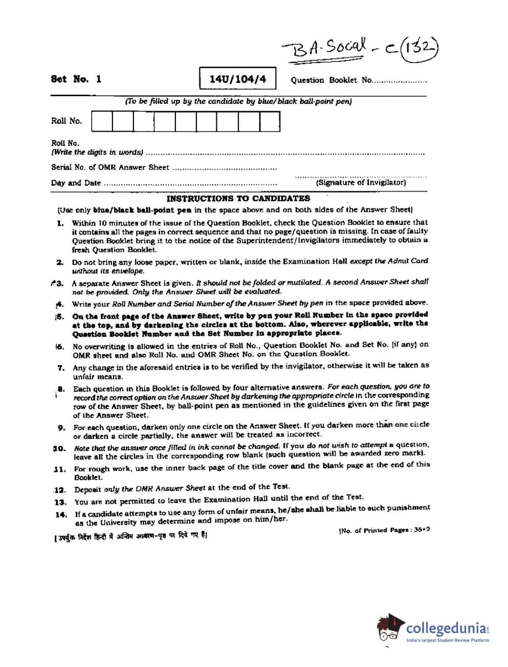 BHU UET 2014 B.A. Social Science Question Paper with Answer Key PDFs
