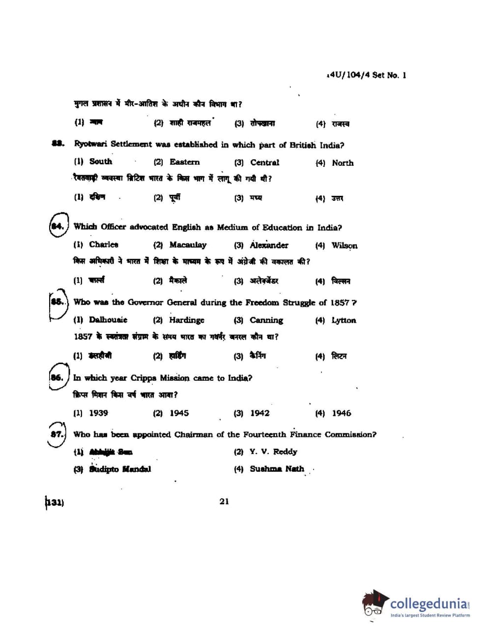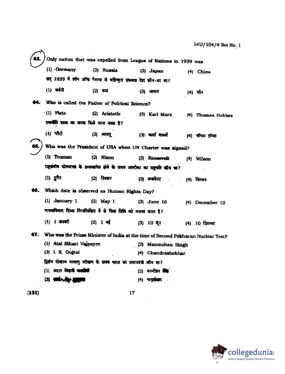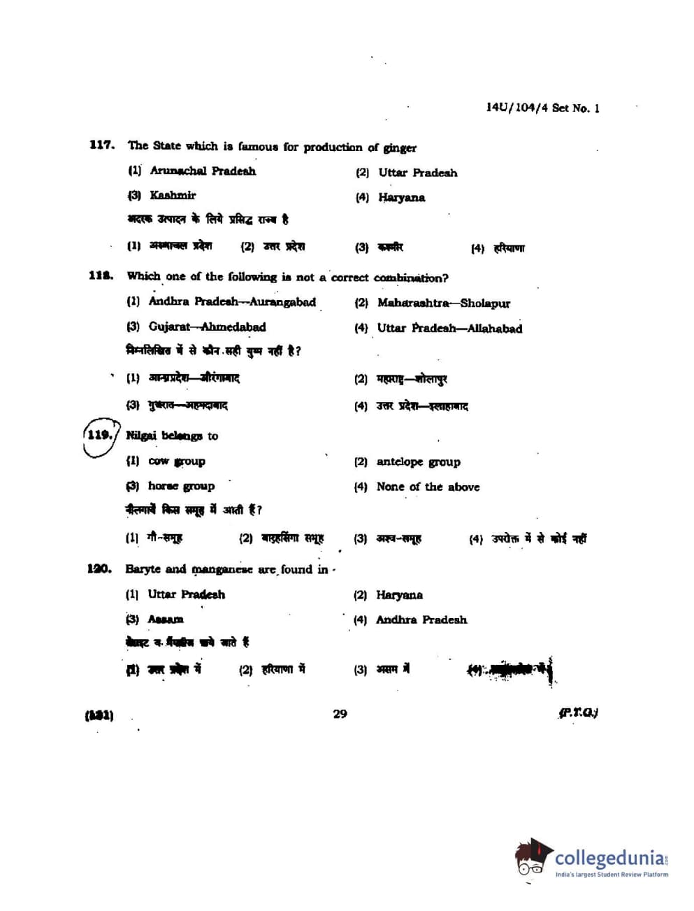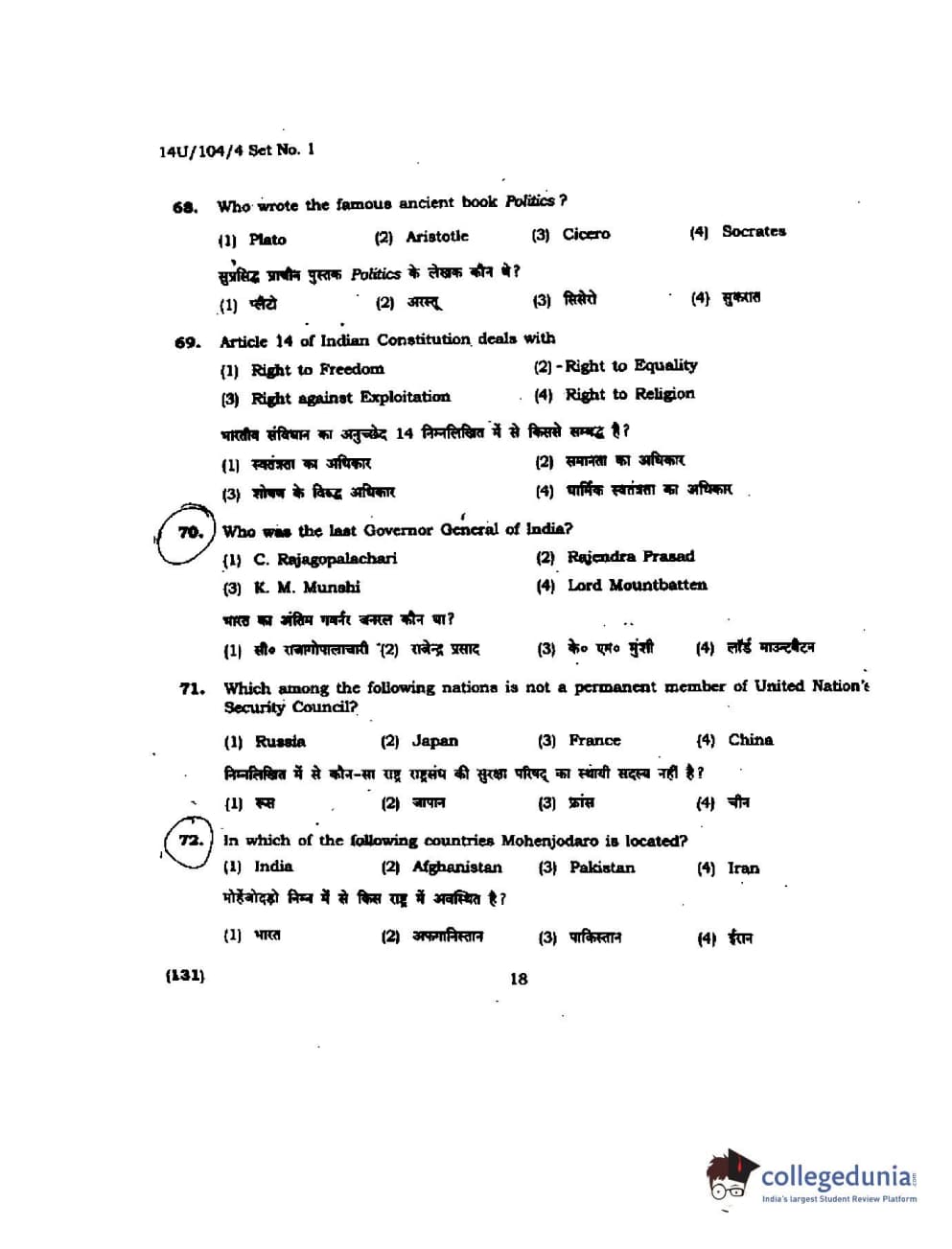 BHU UET 2014 B.A. Social Science Question Paper with Answer Key PDFs