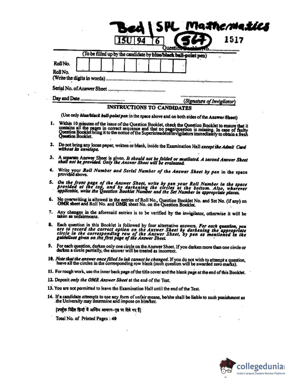 BHU UET 2015 B.Ed Mathematics Question paper with answer key pdf is available for download. The exam was successfully organized by Banaras Hindu University (BHU). The question paper comprised a total of 100 questions.