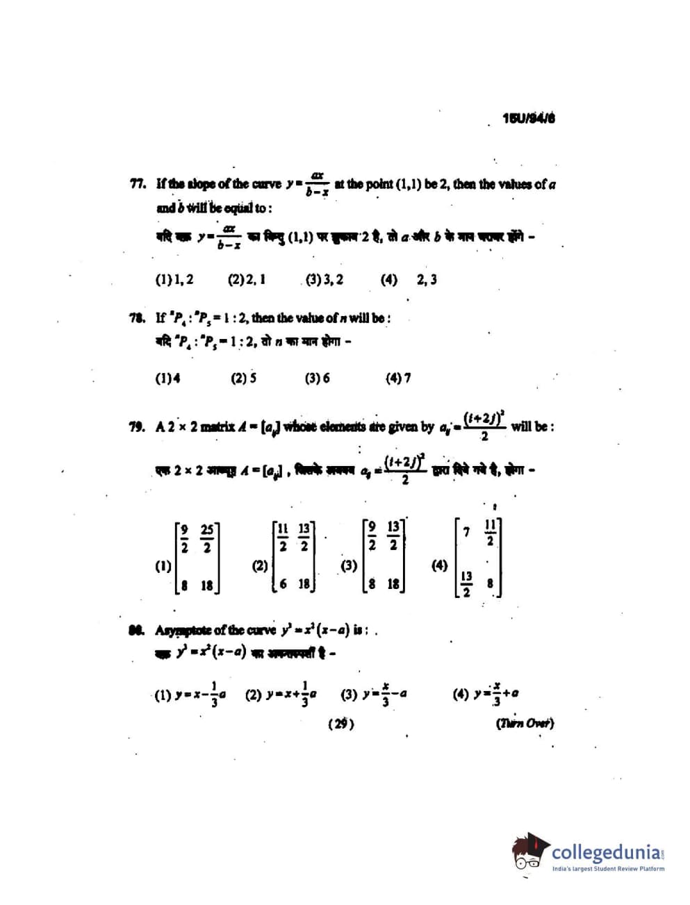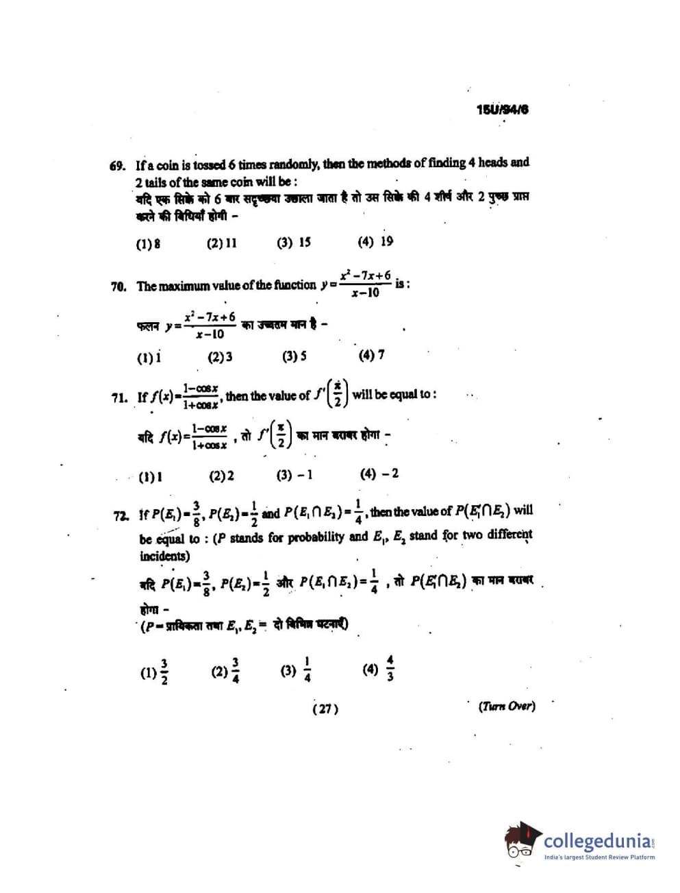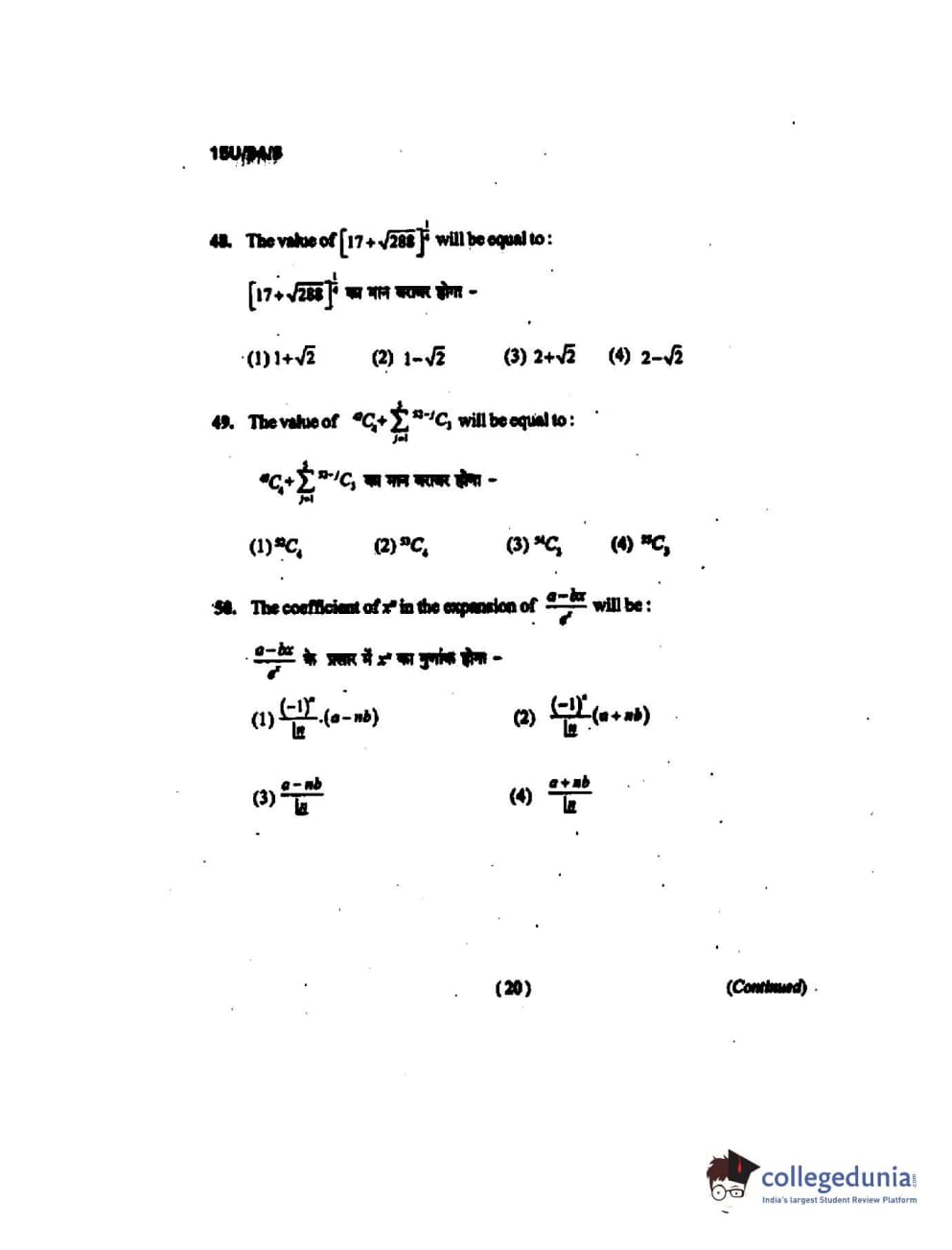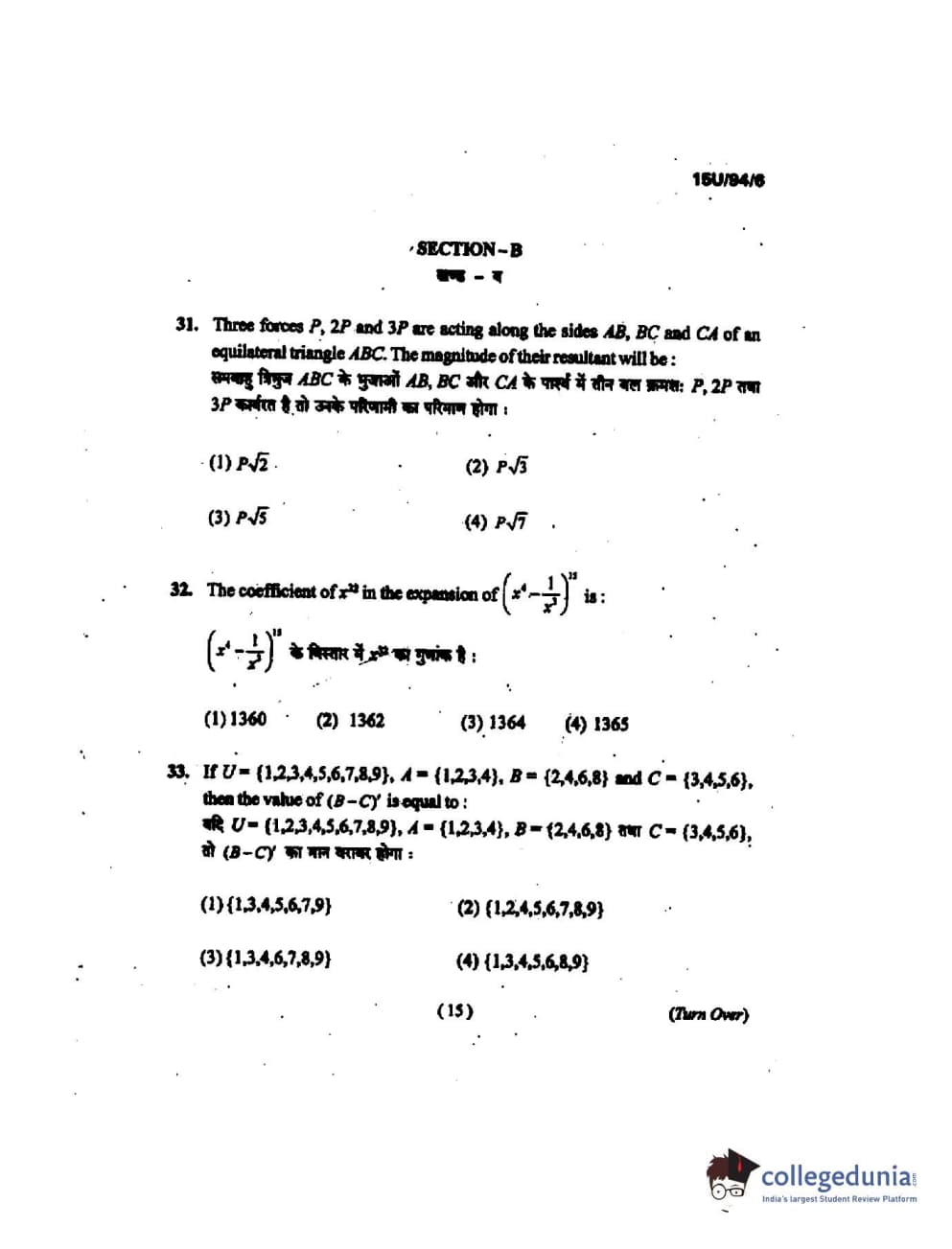 BHU UET 2015 B.Ed Mathematics Question Paper with Answer Key PDFs