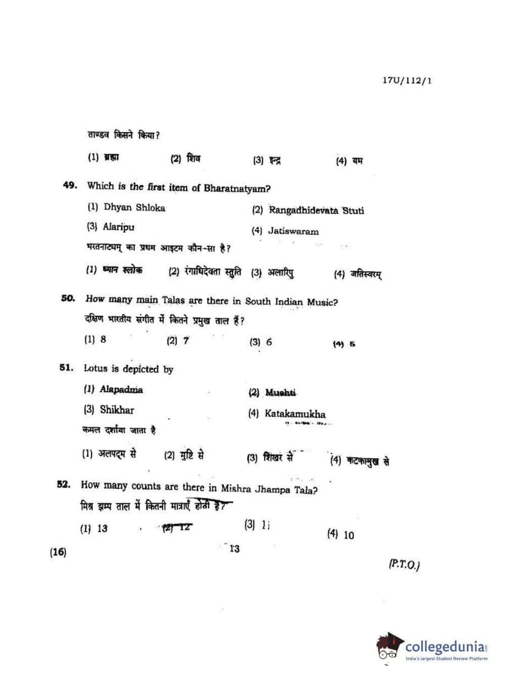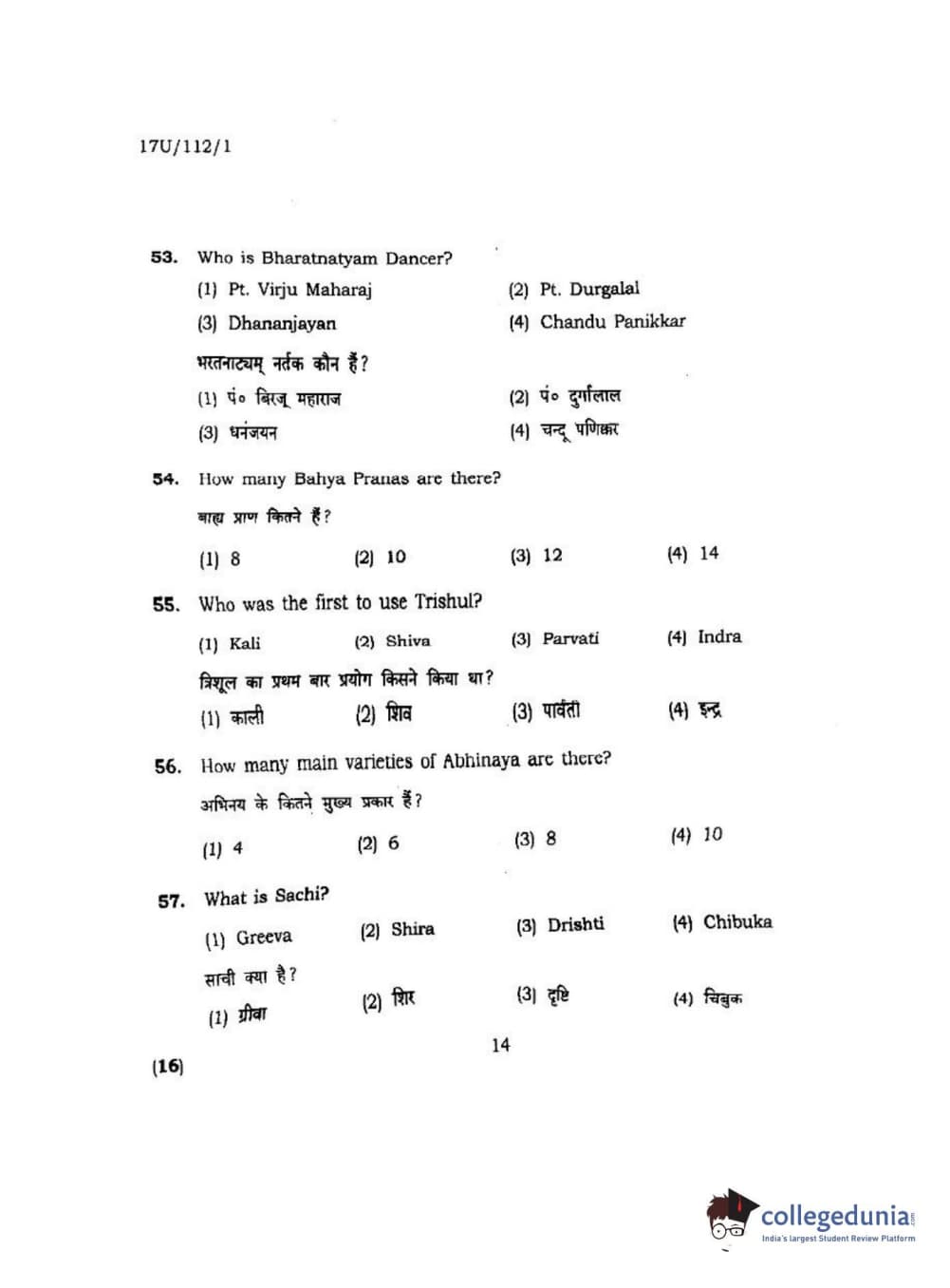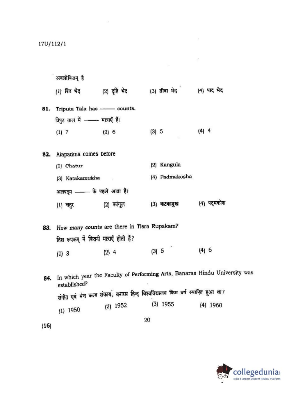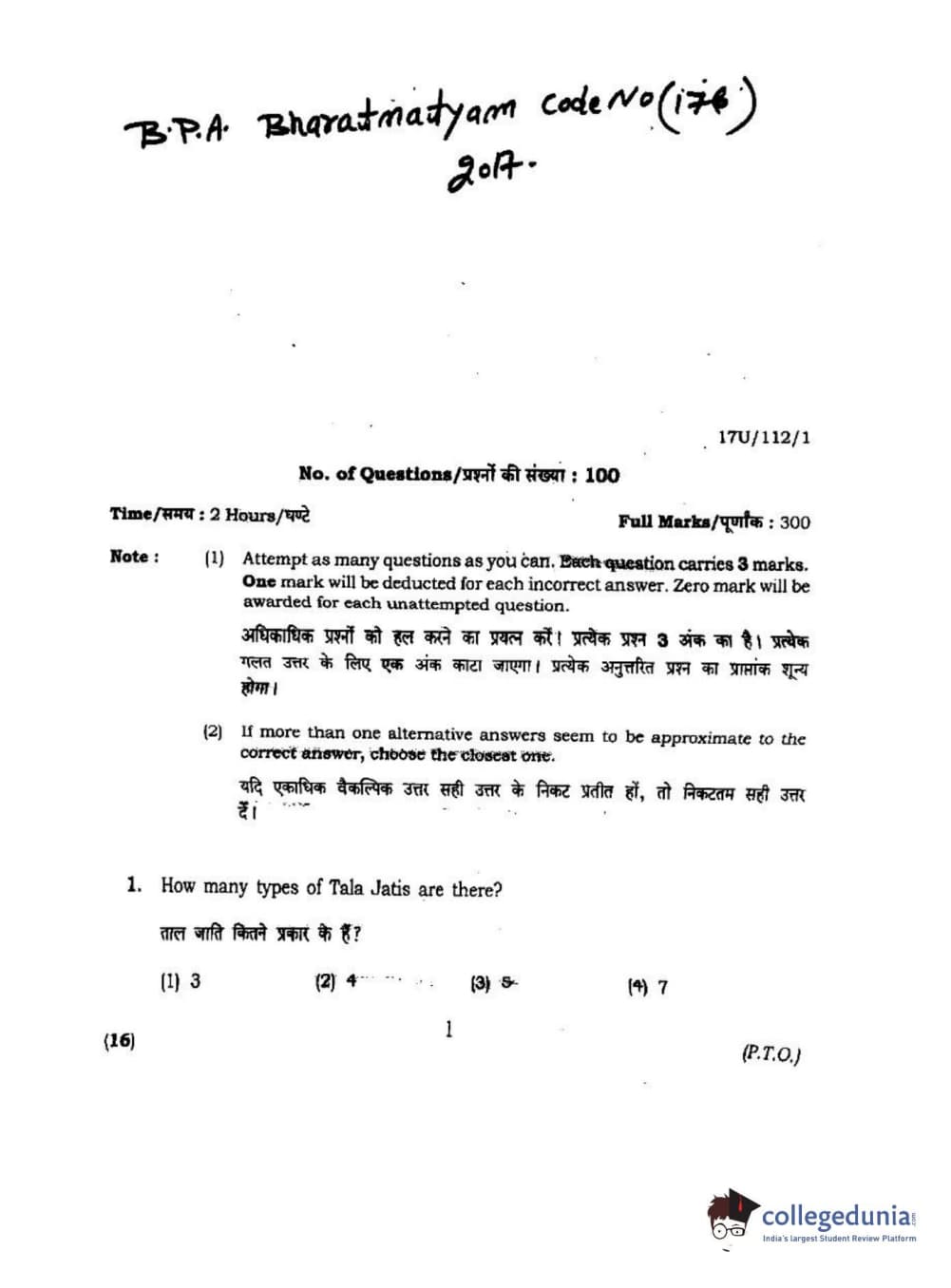 BHU UET 2017 B.P.A Bhartnatyam Question paper with answer key pdf is available for download. The exam was successfully organized by Banaras Hindu University (BHU). The question paper comprised a total of 100 questions.