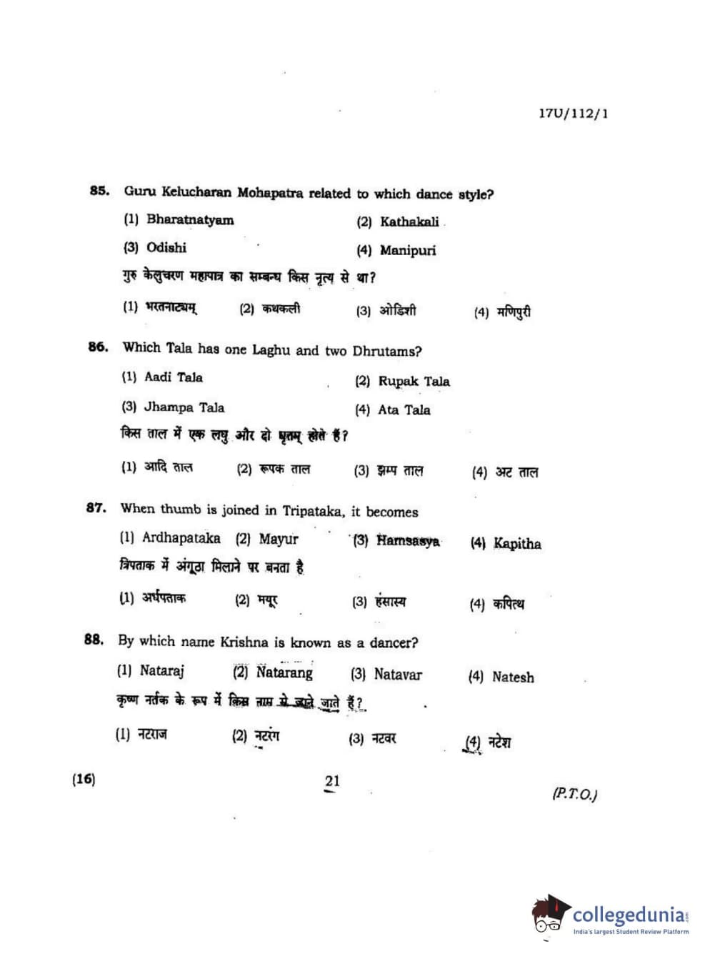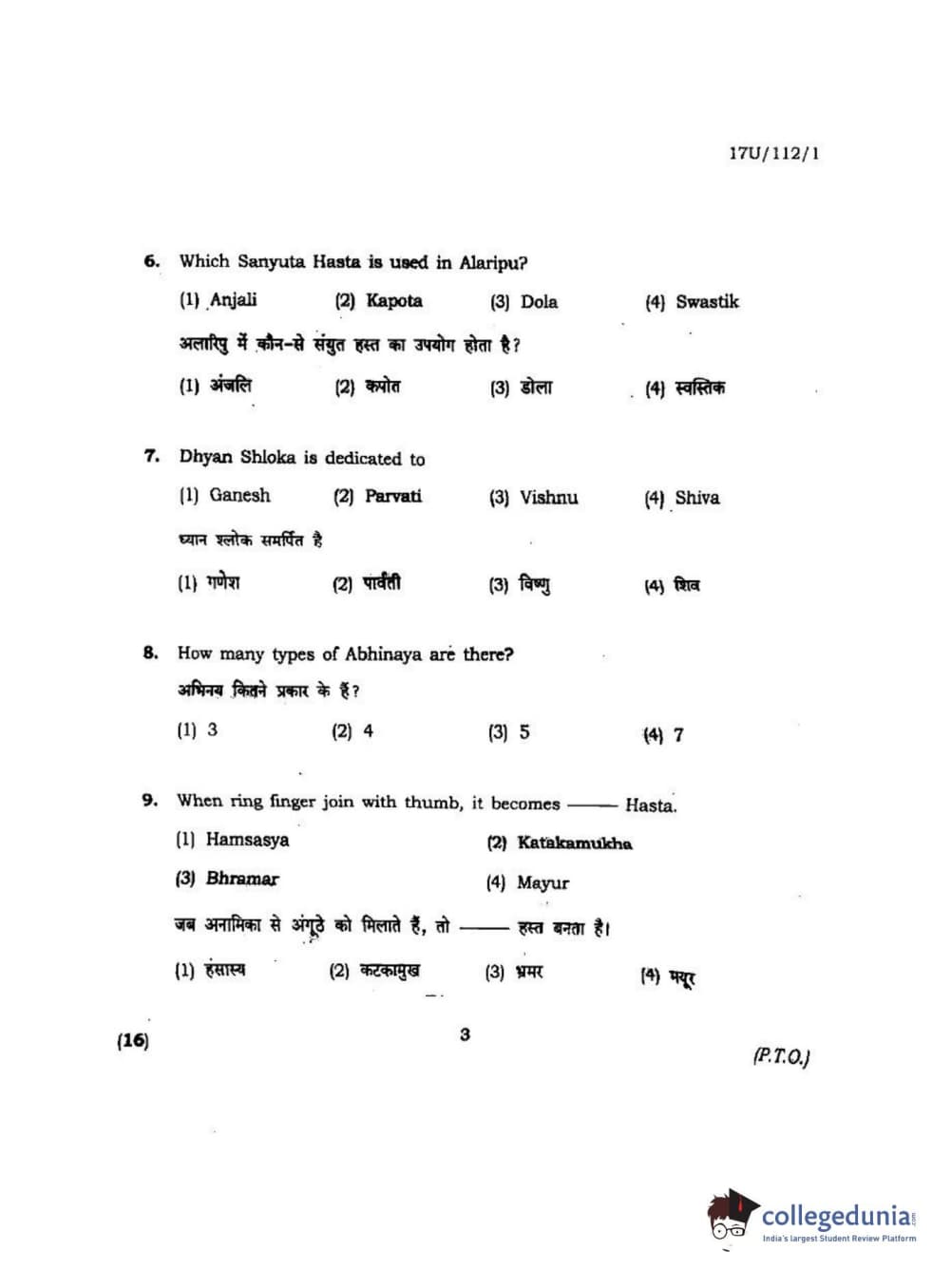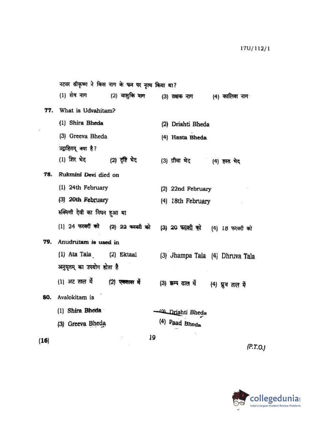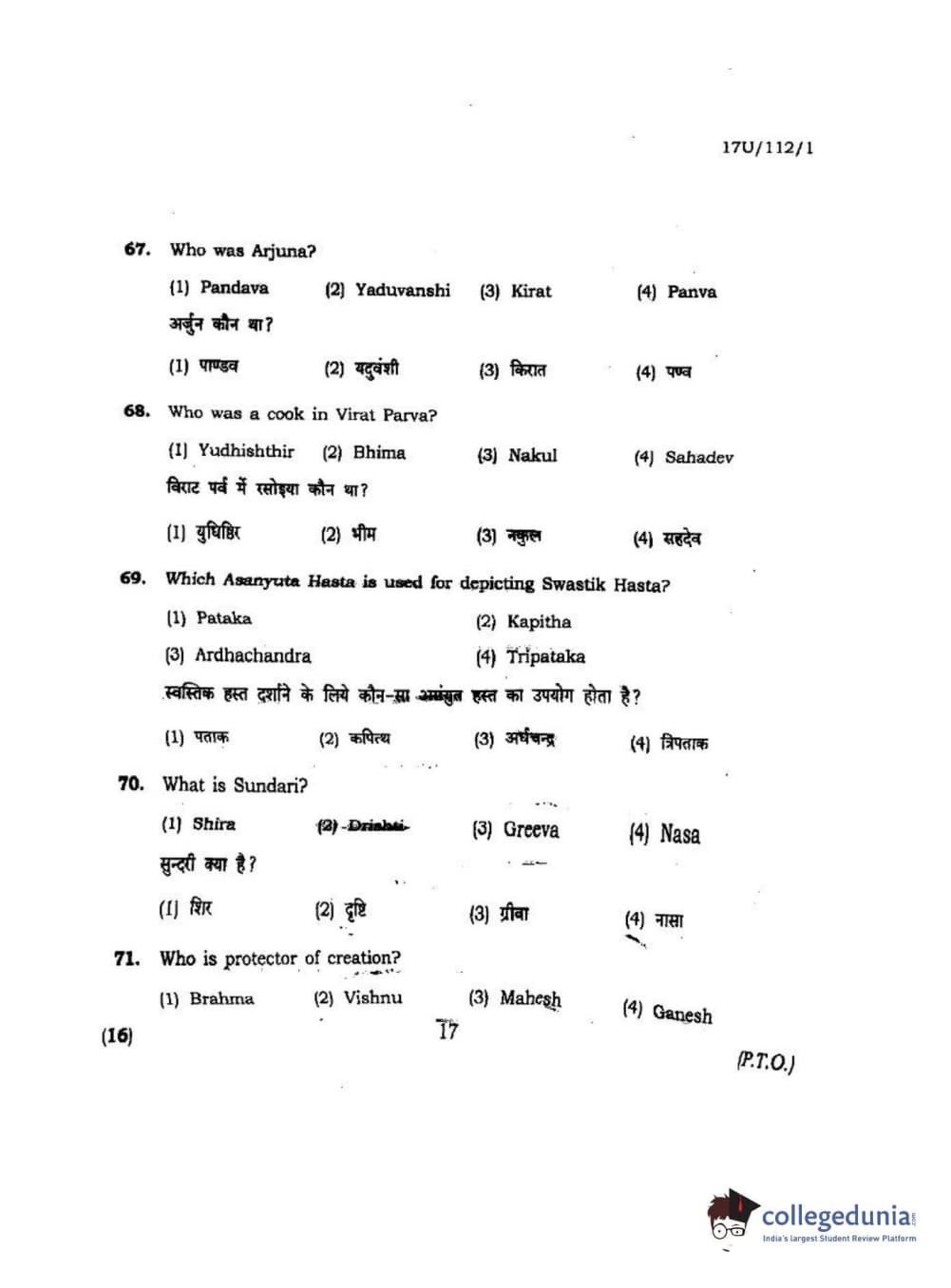 BHU UET 2017 B.P.A Bhartnatyam Question Paper with Answer Key PDFs