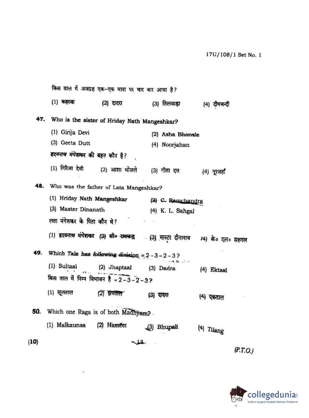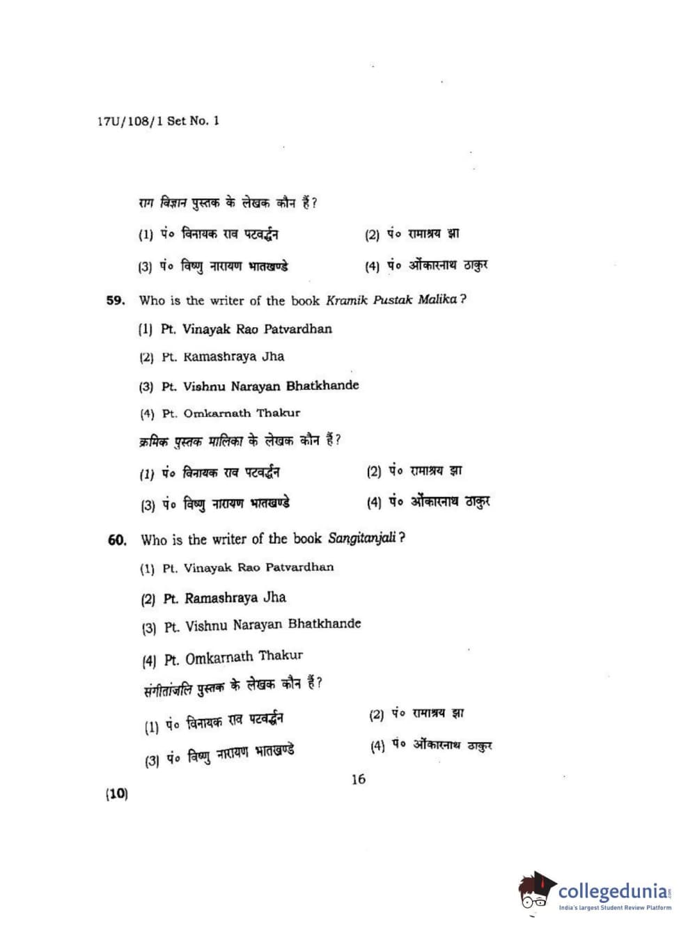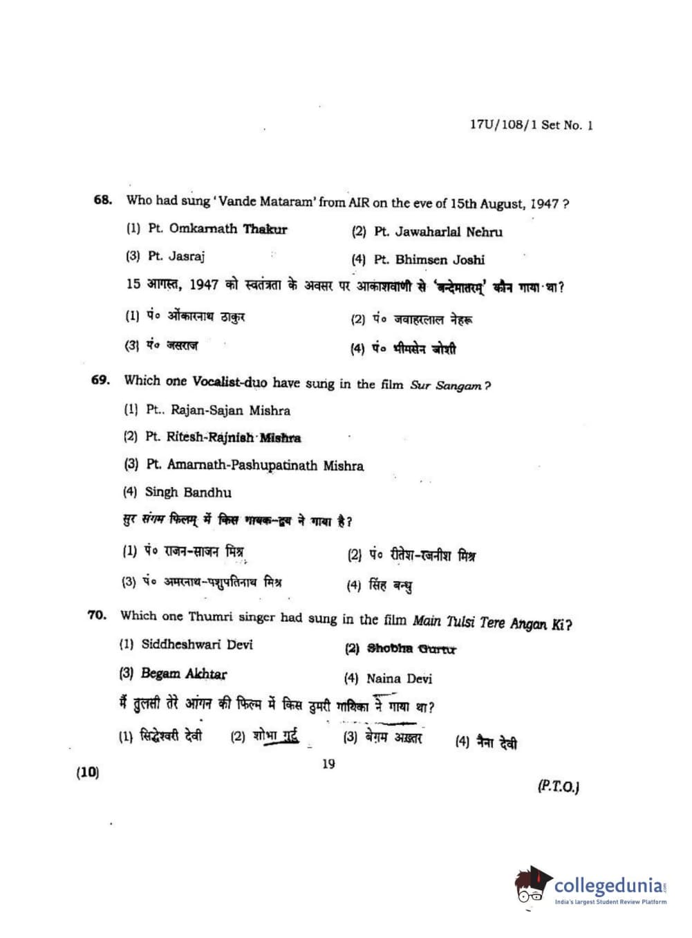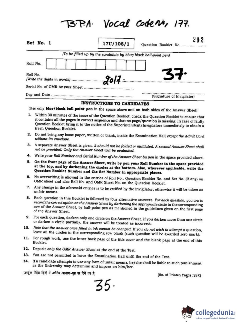 BHU UET 2017 B.P.A Vocal Question Paper with Answer Key PDFs