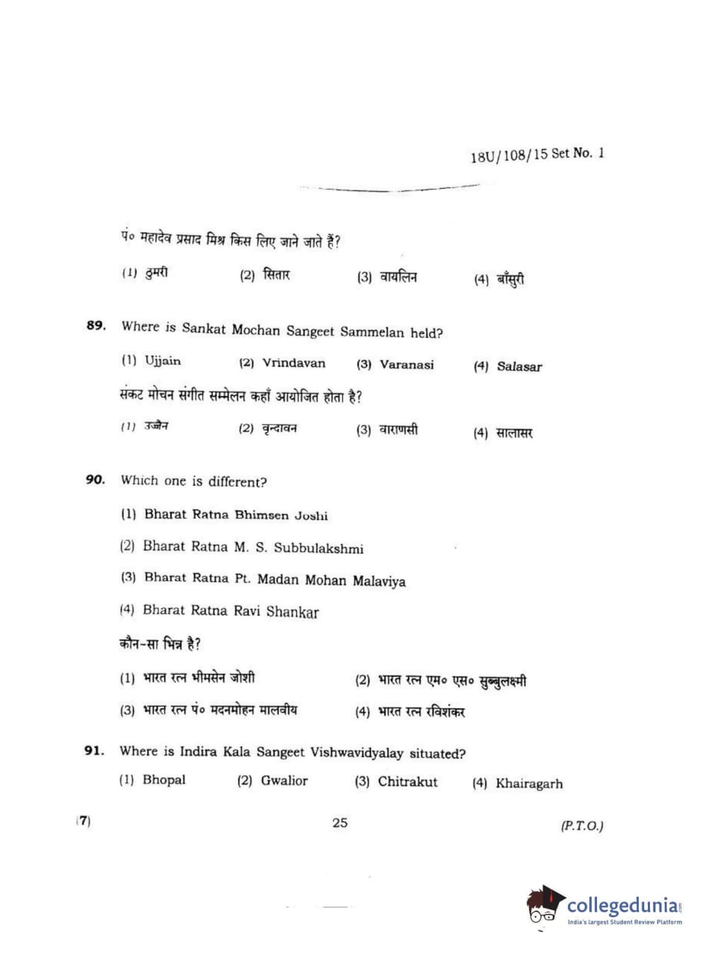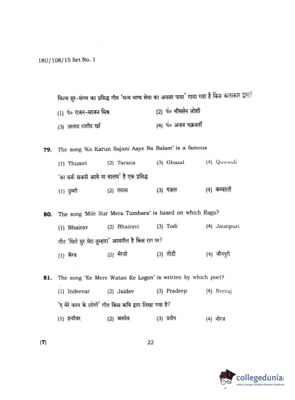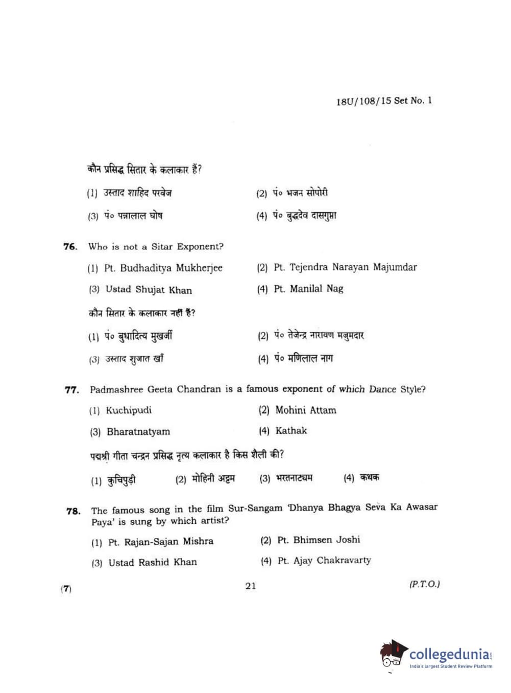 BHU UET 2018 B.P.A VOCAL Question paper with answer key pdf conducted on April 1, 2018 in Shift 1 is available for download. The exam was successfully organized by Banaras Hindu University (BHU). The question paper comprised a total of 100 questions.