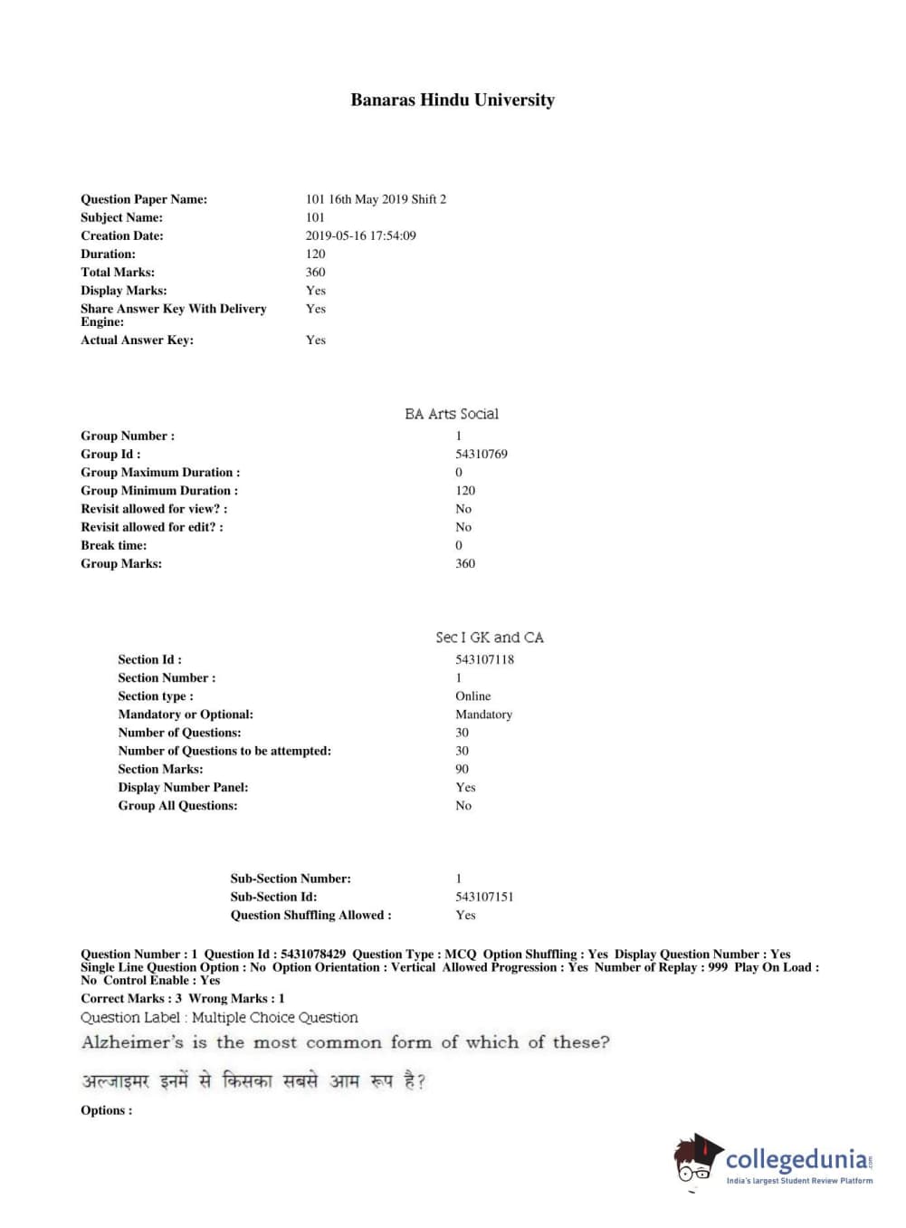BHU UET 2019 B.A. Art Social Question paper with answer key pdf conducted on May 16, 2019 in Shift 2 is available for download. The exam was successfully organized by Banaras Hindu University (BHU). The question paper comprised a total of 150 questions.