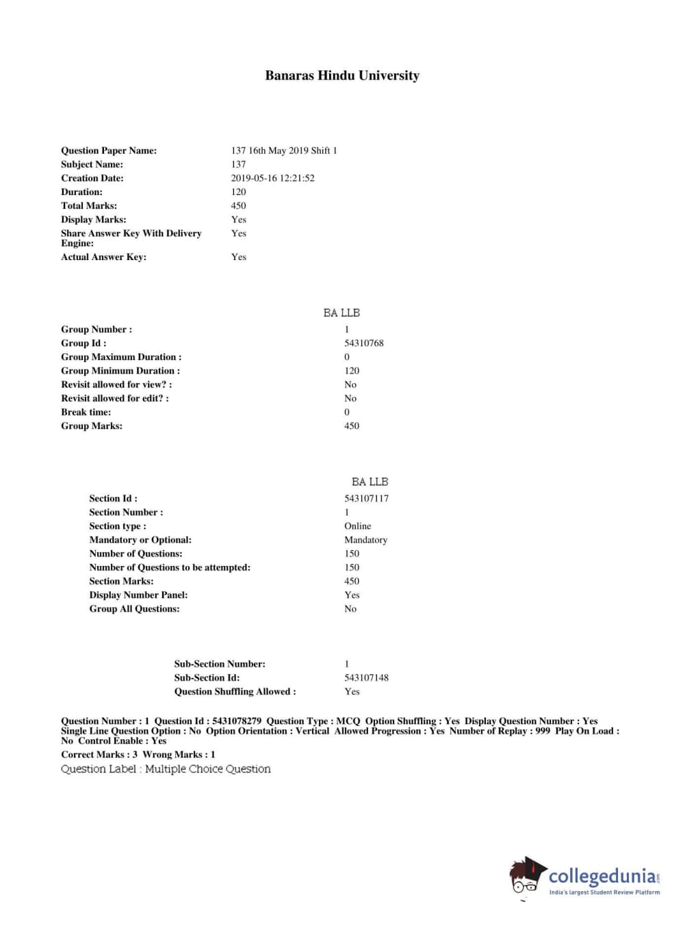 BHU UET 2019 B.A. LLB Question paper with answer key pdf conducted on May 16, 2019 in Shift 1 is available for download. The exam was successfully organized by Banaras Hindu University (BHU). The question paper comprised a total of 150 questions.