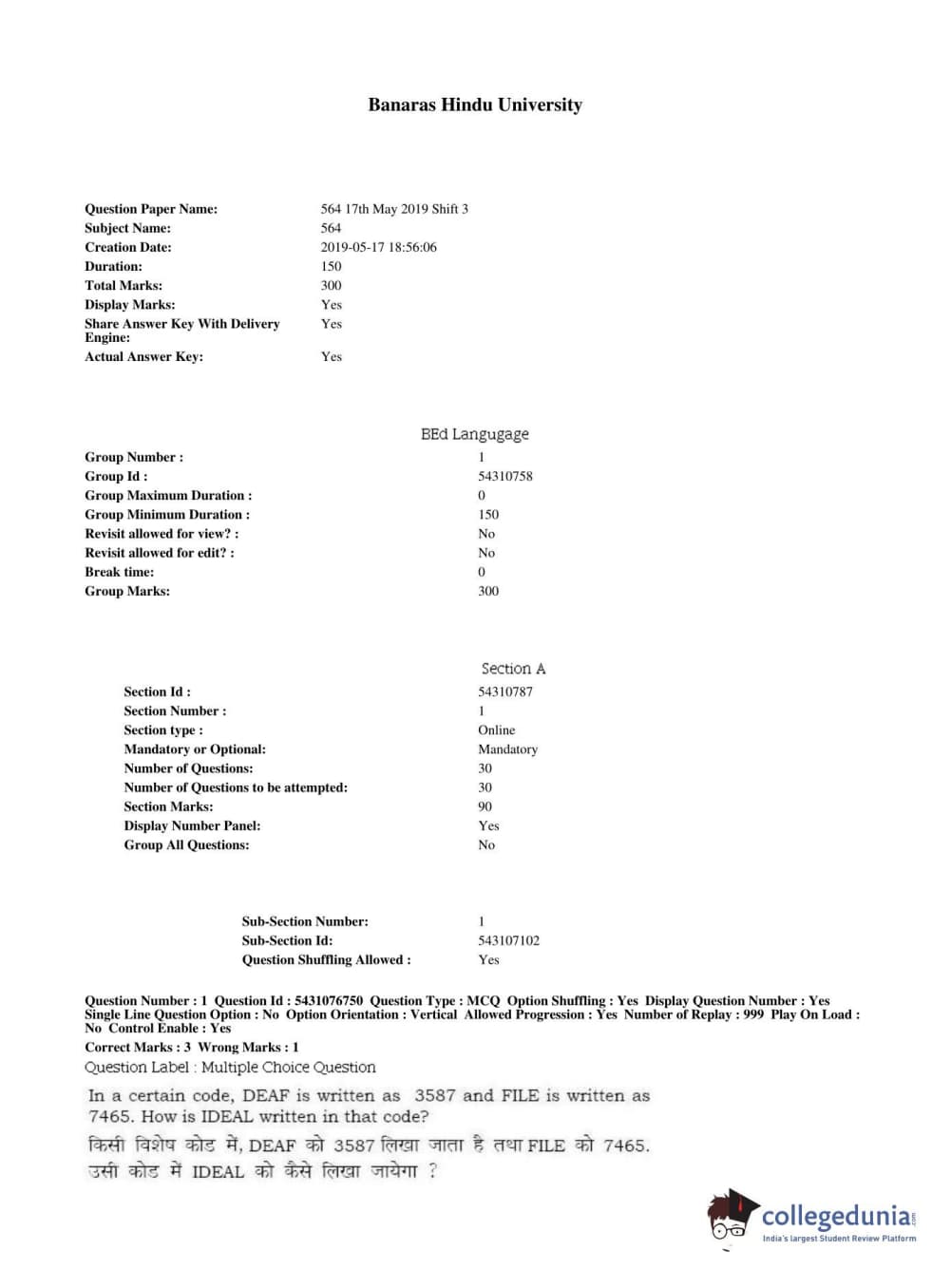 BHU UET 2019 B.ED LANGUAGE Question Paper with Answer Key PDFs Shift 3