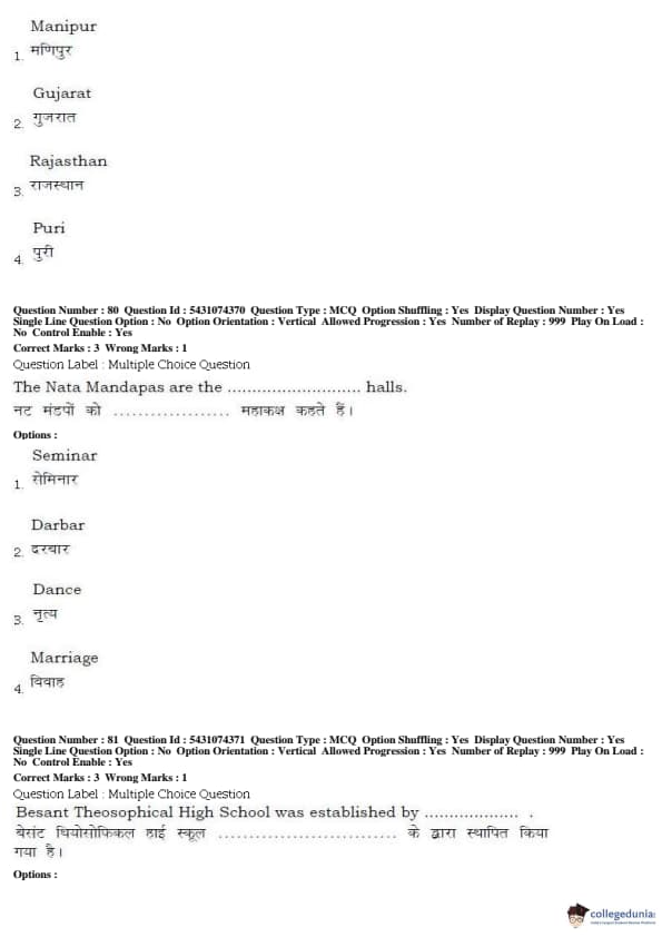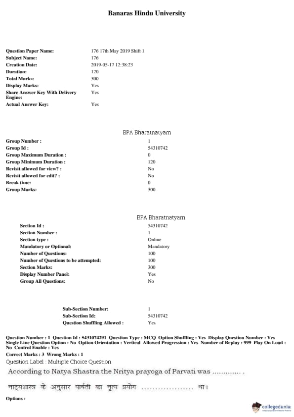 BHU UET 2019 B.P.A BHARATNATYAM Question paper with answer key pdf conducted on May 17, 2019 in Shift 1 is available for download. The exam was successfully organized by Banaras Hindu University (BHU). The question paper comprised a total of 100 questions.