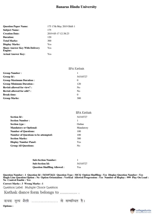 BHU UET 2019 B.P.A KATHAK Question paper with answer key pdf conducted on May 17, 2019 in Shift 1 is available for download. The exam was successfully organized by Banaras Hindu University (BHU). The question paper comprised a total of 100 questions.