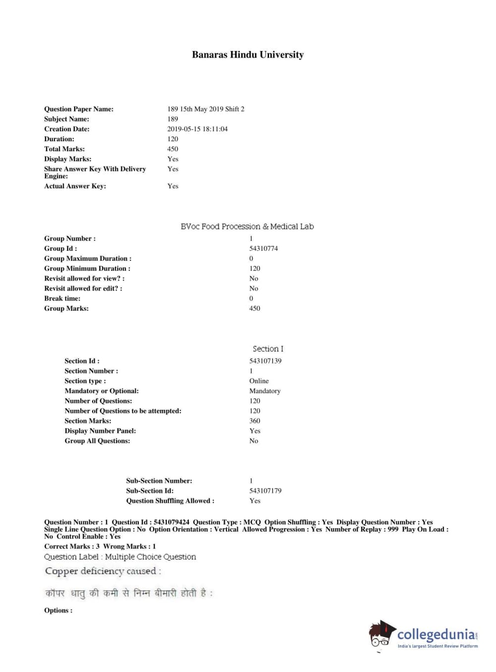 BHU UET 2019 B.VOC IN FOOD PROCESSING & MLT Question paper with answer key pdf conducted on May 15, 2019 in Shift 2 is available for download. The exam was successfully organized by Banaras Hindu University (BHU). The question paper comprised a total of 180 questions.