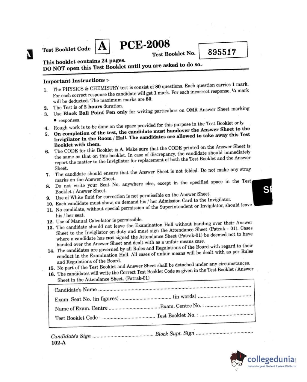 GUJCET 2008 Physics & Chemistry Question paper with answer key pdf is available for download. The exam was successfully organized by GSEB. The question paper comprised a total of 80 questions.