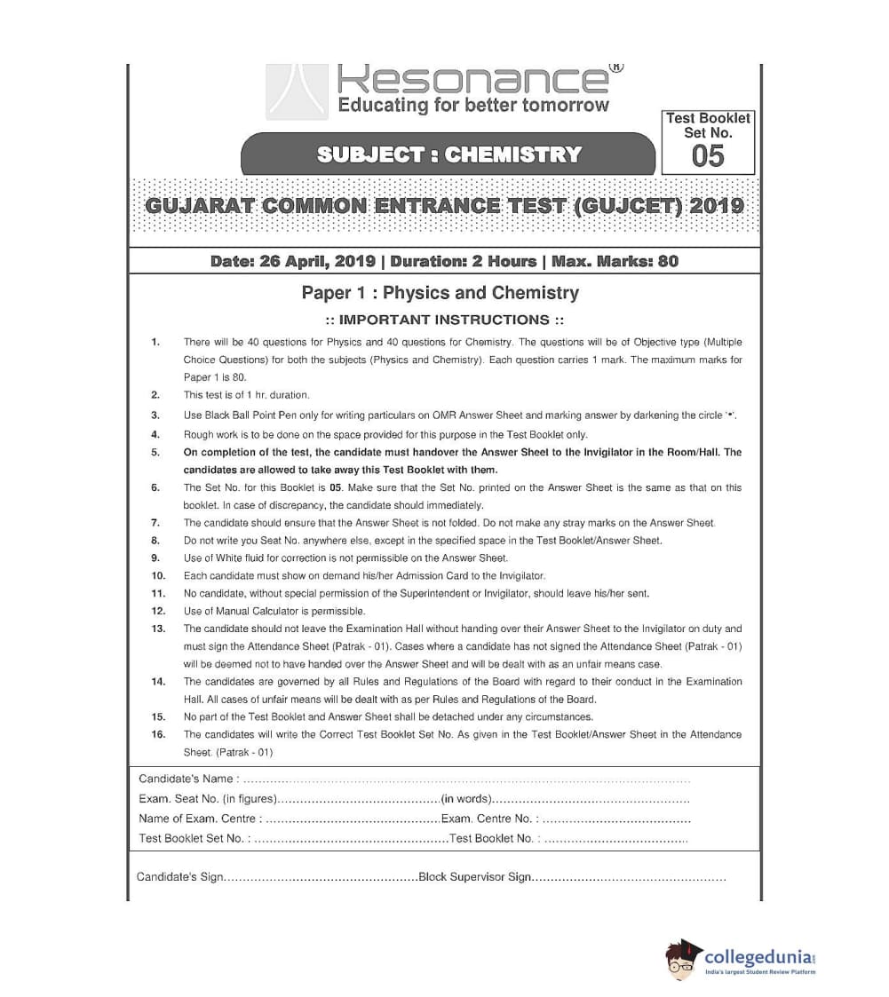 GUJCET 2019 Physics & Chemistry Question paper with answer key pdf conducted on April 26, 2019 is available for download. The exam was successfully organized by GSEB. The question paper comprised a total of 80 questions.
