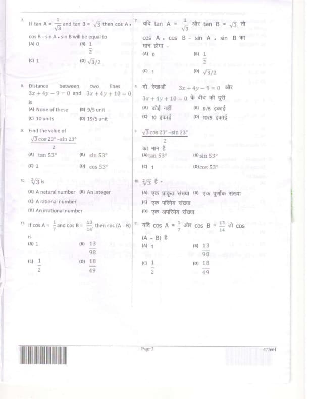 If tan \(A = \frac{1}{\sqrt{3}}\) and tan \(B = \sqrt{3}\) then \(\cos A - \cos B - \sin A \cdot \sin B\) will be equal to