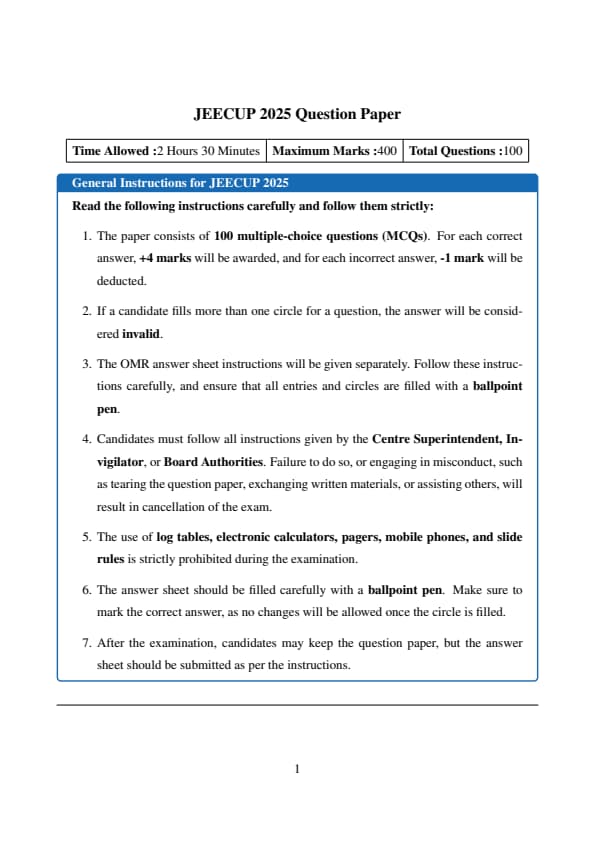 JEECUP Question Paper 2025 with Answer key and Solution PDF are available here. JEECUP question papers vary from Group A to Group K. Candidates are awarded 4 marks for every correct answer and 1 mark is deducted for every incorrect answer.