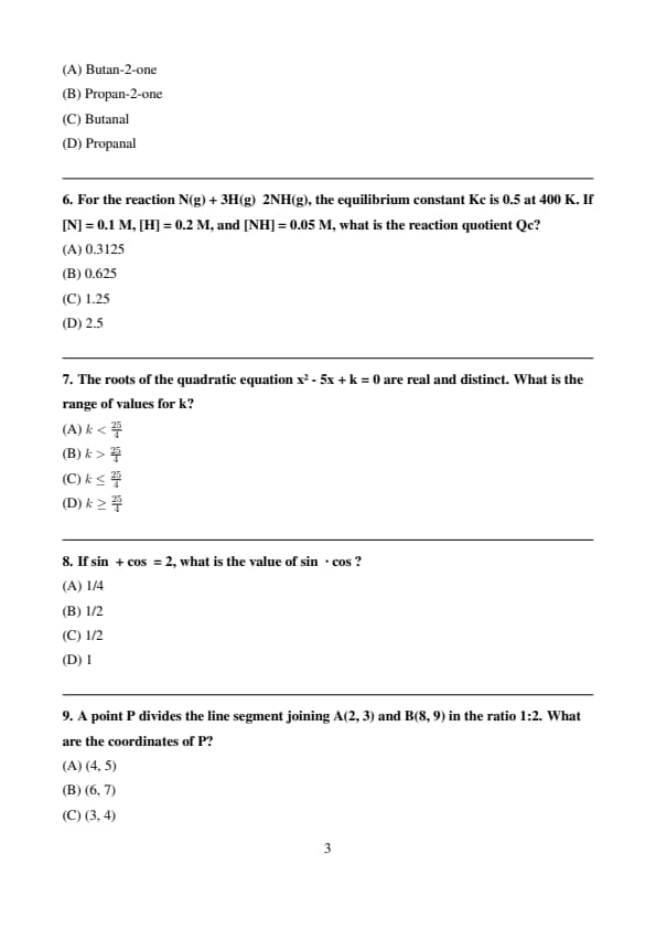 For the reaction N₂(g) + 3H₂(g) ⇌ 2NH₃(g), the equilibrium constant Kc is 0.5 at 400 K. If [N₂] = 0.1 M, [H₂] = 0.2 M, and [NH₃] = 0.05 M, what is the reaction quotient Qc?
