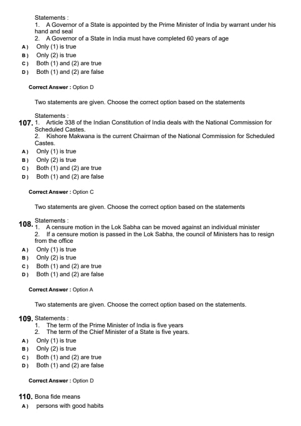 Therefore, both statements (1) and (2) are true. Quick Tip: Article 338 establishes the NCSC to protect Scheduled Castes’ rights, with leadership appointed by the government.