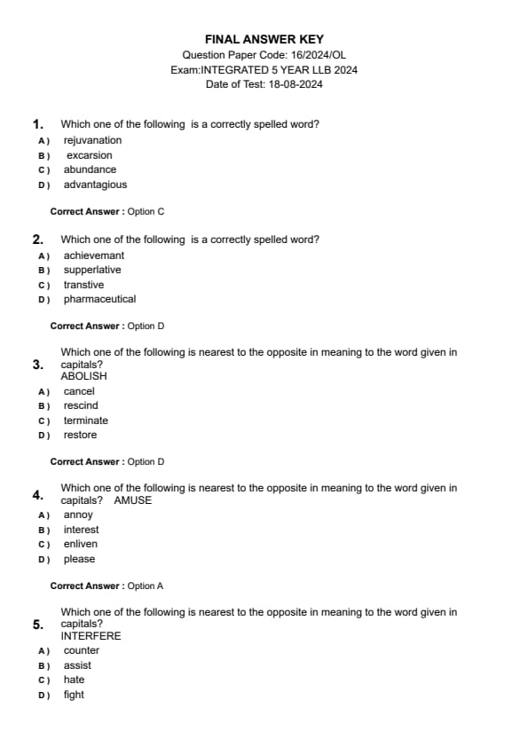 KLEE 2024 LLB 5 Year Question paper with Solution PDF is available for download. The exam was successfully organized by Commissioner of Entrance Examinations (CEE). The question paper comprised a total of 120 questions divided among four sections.