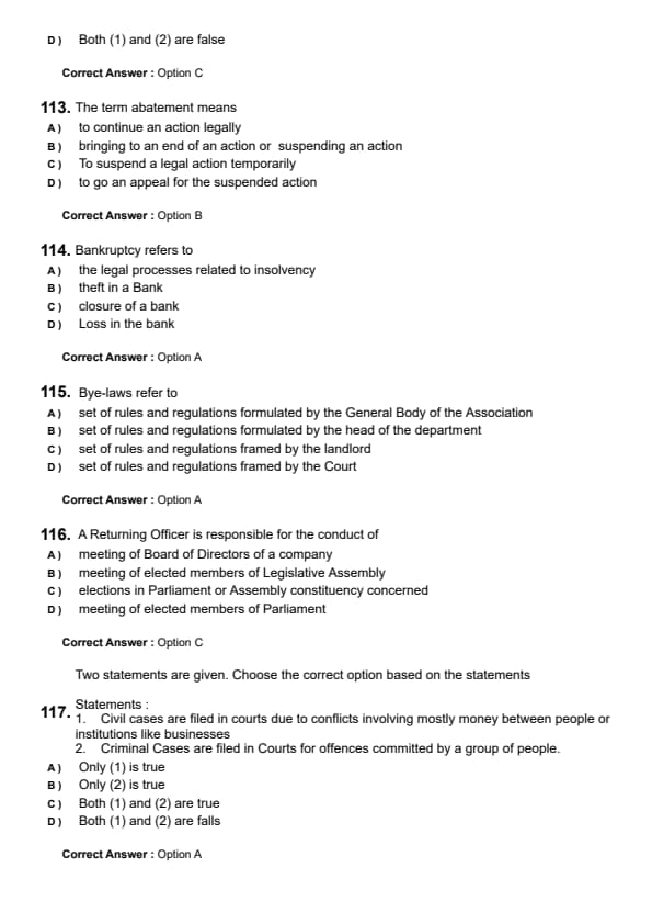 Statement 2: False — Criminal cases are not necessarily about "groups". Even one person committing theft, assault, or murder faces criminal trial. The number of offenders is irrelevant. Quick Tip: Civil = personal disputes (like contracts, land, money).