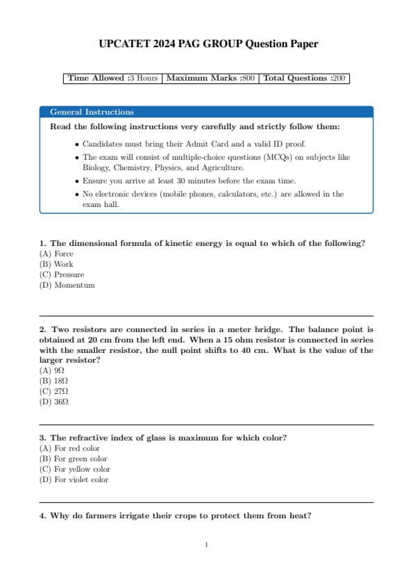 The UPCATET (Uttar Pradesh Combined Agricultural and Technology Entrance Test) includes subjects like Physics, Chemistry, Mathematics/Biology, and General Knowledge. The exam is a pen and paper-based test that lasts 2 to 3 hours. candidate get 4 marks for every correct answer,