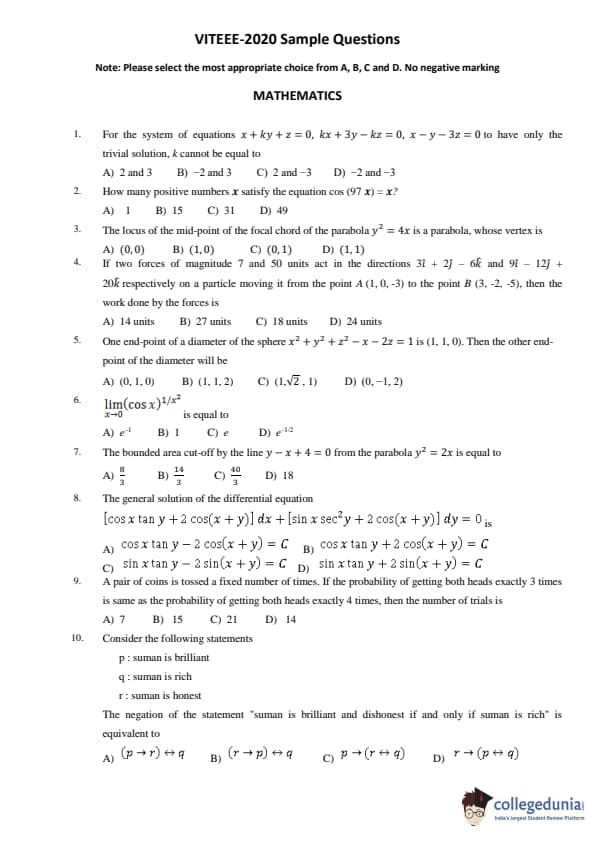| VITEEE 2020 Mathematics Question Paper PDF | VITEEE 2020 Mathematics Answer Key PDF |