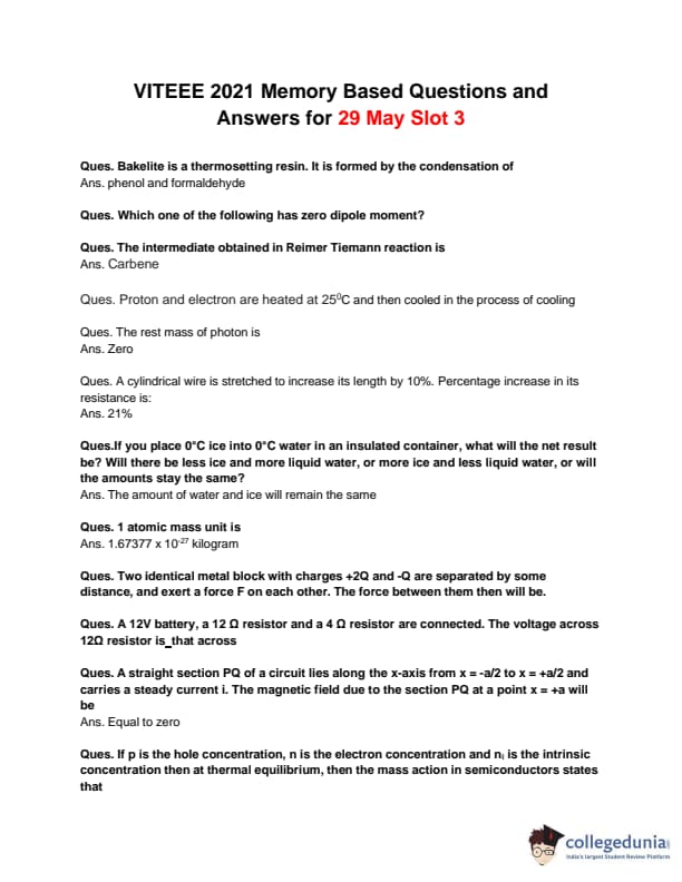 VITEEE 2021 Question Papers: The memory-based question paper for VITEEE 2021 Slot 3 Day 2 is available in this article. VITEEE 2021 Slot 3 Day 2 was conducted by VIT University, Vellore on May 29, 2021. The exam was conducted from 4:00 pm to 06:30 pm which was 2hr and 30 minutes. The difficulty level of VITEEE 2021 Slot 3 Day 2 Question Paper was rated moderately easy.
