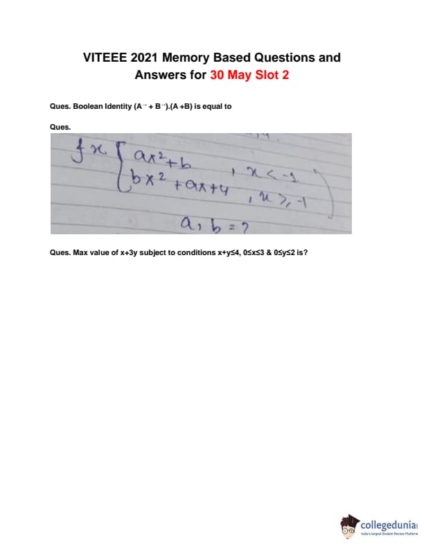VITEEE 2021 Question Papers: The memory-based question paper for VITEEE 2021 slot 2 day 3 is available in this article. VITEEE 2021 Slot 2 day 3 was conducted by VIT University, Vellore on May 30, 2021. The exam was conducted from 12:30 pm to 03:00 pm which was 2hr and 30 minutes. The difficulty level of VITEEE 2021 Slot 2 Day 3 Question Paper was rated moderately easy.