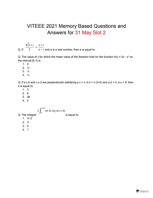 VITEEE 2021 Question Papers: The memory-based question paper for VITEEE 2021 Slot 2 Day 4 is available in this article. VITEEE 2021 Slot 2 Day 4 was conducted by VIT University, Vellore on May 31, 2021. The exam was conducted from 12:30 pm to 03:00 pm which was 2hr and 30 minutes. The difficulty level of VITEEE 2021 Slot 2 Day 4 Question Paper was rated moderately easy.