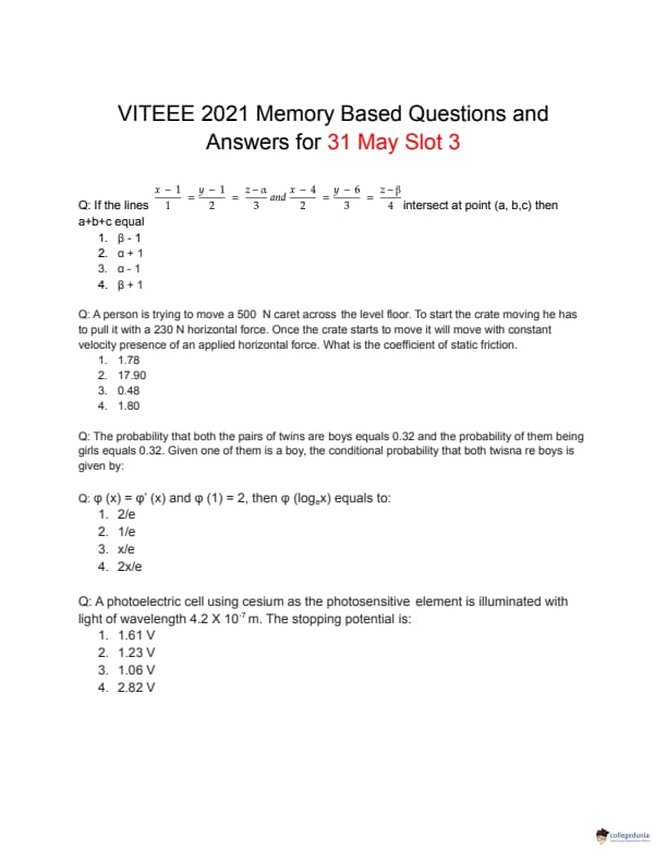 VITEEE 2021 Question Papers: The memory-based question paper for VITEEE 2021 Slot 3 Day 4 is available in this article. VITEEE 2021 Slot 3 Day 4 was conducted by VIT University, Vellore on May 31, 2021. The exam was conducted from 04:00 pm to 06:30 pm which was 2hr and 30 minutes. The difficulty level of VITEEE 2021 Slot 3 Day 4 Question Paper was rated moderately easy.