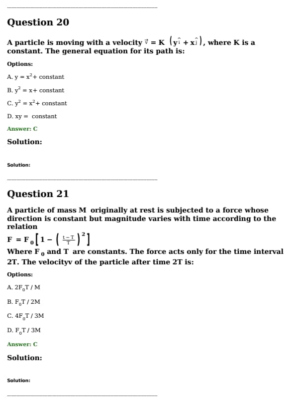 A particle of mass M originally at rest is subjected to a force whose direction is constant but magnitude varies with time according to the relation \[ F = F_0 \left[ 1 - \left( \frac{t - T}{T} \right)^2 \right] \] Where \( F_0 \) and \( T \) are constants. The force acts only for the time interval \( 2T \). The velocity \( v \) of the particle after time \( 2T \) is: