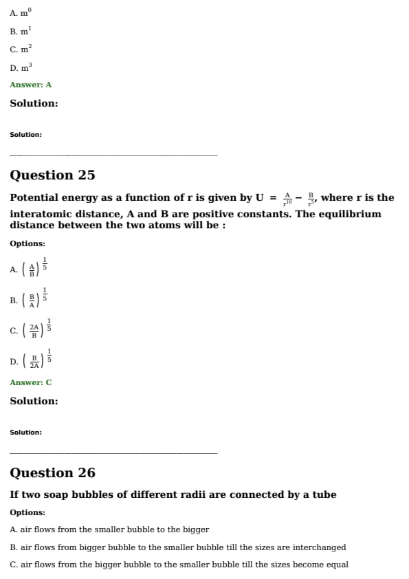 Potential energy as a function of \(r\) is given by \( U = \frac{A}{r^{10}} - \frac{B}{r^5} \), where \(r\) is the interatomic distance, \(A\) and \(B\) are positive constants. The equilibrium distance between the two atoms will be: