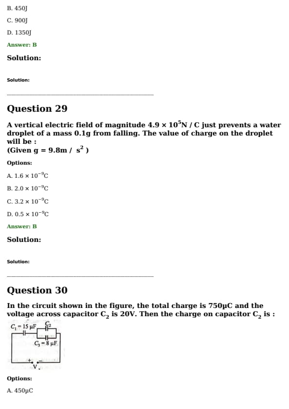 A vertical electric field of magnitude \( 4.9 \times 10^5 \, \text{N/C} \) just prevents a water droplet of a mass \( 0.1 \, \text{g} \) from falling. The value of charge on the droplet will be: (Given \( g = 9.8 \, \text{m/s}^2 \))