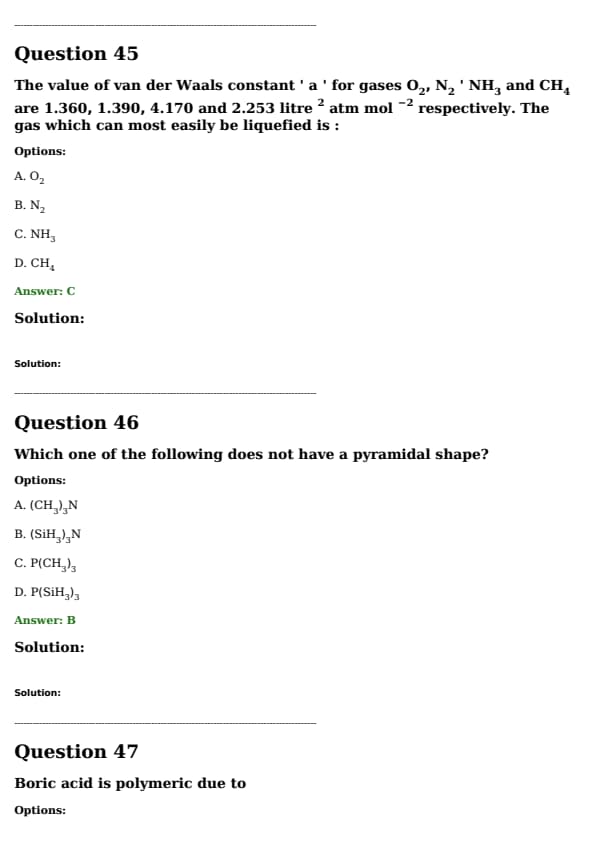 The value of van der Waals constant ' a ' for gases \( \text{O}_2 \), \( \text{N}_2 \), \( \text{NH}_3 \), and \( \text{CH}_4 \) are 1.360, 1.390, 4.170, and 2.253 L\(^2\)atm/mol\(^2\) respectively. The gas which can most easily be liquefied is:
