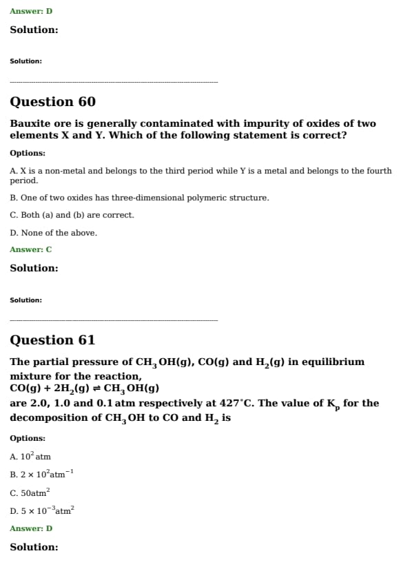 The partial pressure of \(CH_3\) OH(g), CO(g) and \(H_2(g)\) in equilibrium mixture for the reaction, CO(g) + (2H_2(g)) \rightleftharpoons \(CH_3OH(g)) ] are 2.0, 1.0 and 0.1 atm respectively at \(427^\circ C\). The value of \(K_p\) for the decomposition of \(CH_3OH\) to CO and \(H_2\) is: \flushleft