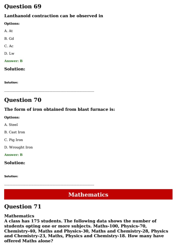A class has 175 students. The following data shows the number of students opting for one or more subjects. Maths = 100, Physics = 70, Chemistry = 40, Maths and Physics = 30, Maths and Chemistry = 28, Physics and Chemistry = 23, Maths, Physics, and Chemistry = 18.