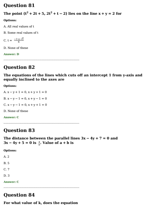 The point \( (t^2 + 2t + 5, 2t^2 + t - 2) \) \text{ lies on the line \( x + y = 2 \) \text{ for: