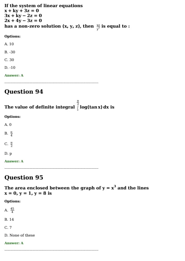 If the system of linear equations \[ x + ky + 3z = 0, \quad 3x + ky - 2z = 0, \quad 2x + 4y - 3z = 0 \] \text{has a non-zero solution \( (x, y, z) \), then \( \frac{xz}{y^2} \) is equal to: