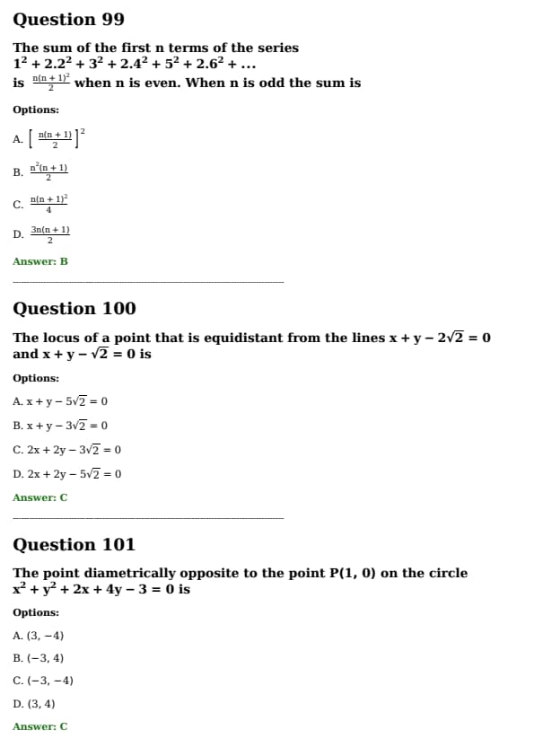 The sum of the first n terms of the series \[ 1^2 + 2.2^2 + 3^2 + 2.4^2 + 5^2 + 2.6^2 + \cdots \] \text{is \[ \frac{n(n + 1)^2}{2} \text{ when n is even. When n is odd the sum is} \]