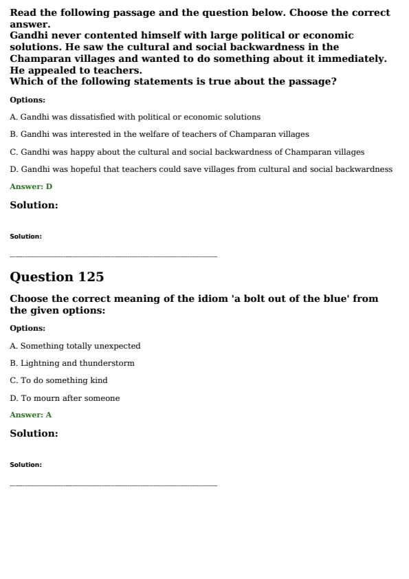 Read the following passage and the question below. Choose the correct answer. \textit{Gandhi never contented himself with large political or economic solutions. He saw the cultural and social backwardness in the Champaran villages and wanted to do something about it immediately. He appealed to teachers. Which of the following statements is true about the passage?