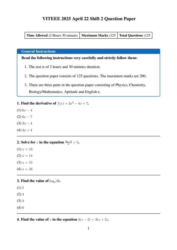 VITEEE 2025 22 April Shift 2 Question Paper is available here with solutions pdf. Vellore Institute of Technology is conducting VITEEE 2025 from April 20 to April 27. VITEEE 2025 Question Paper includes 40 questions from Mathematics/Biology, 35 questions from Physics, 35 questions from Chemistry, 5 questions from English, and 10 questions from Aptitude to be attempted in 150 minutes.
