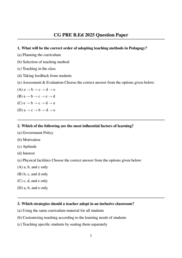 | CG Pre BEd 2025 Question Paper with Solution PDF | Download PDF | Check Solutions |