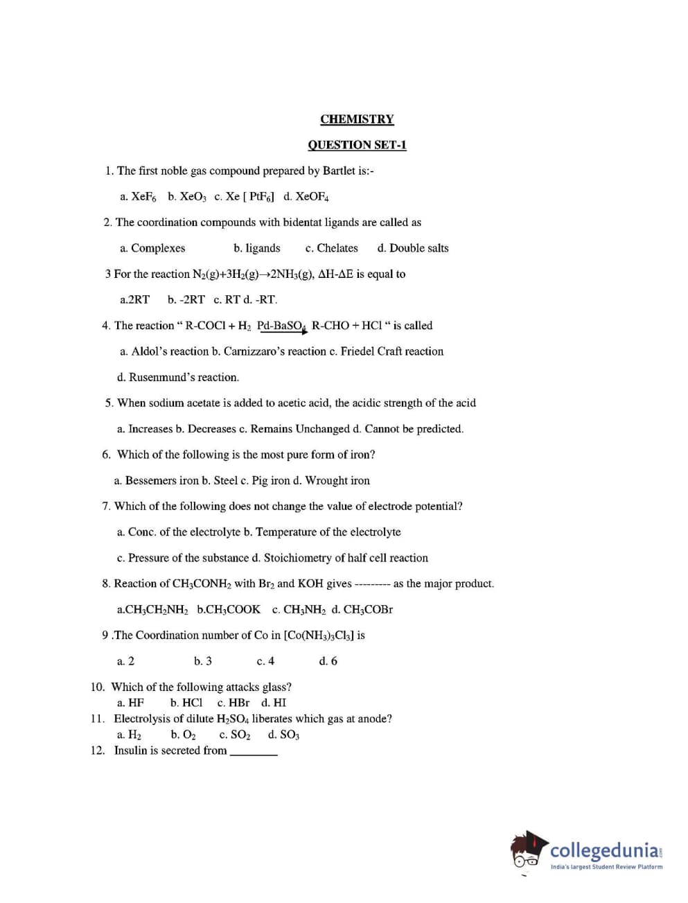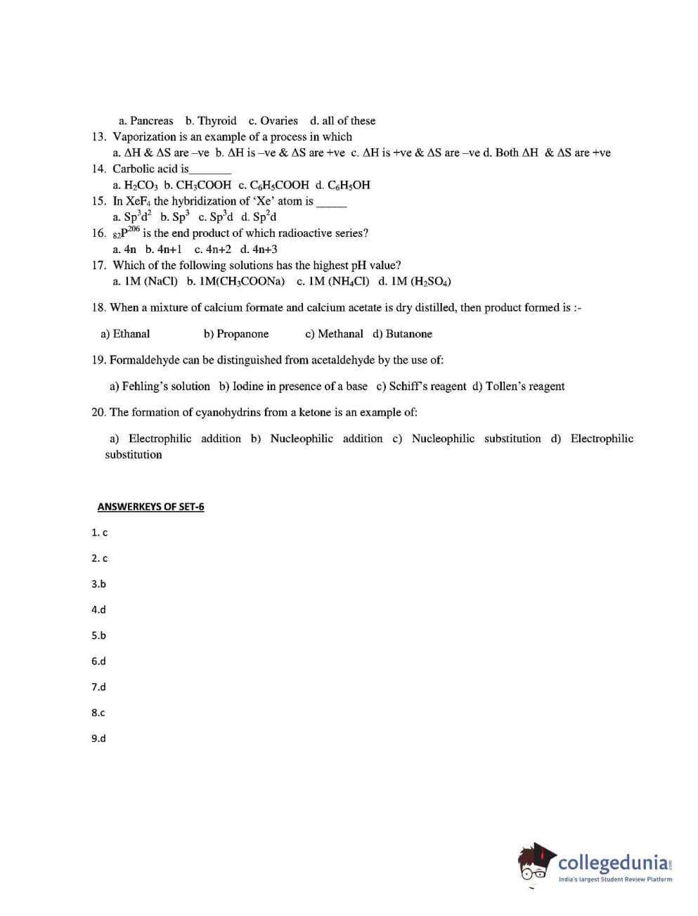 CUEE 2016 B-SC AG. CHEMISTRY SET 1 Question Paper with Answer Key PDFs