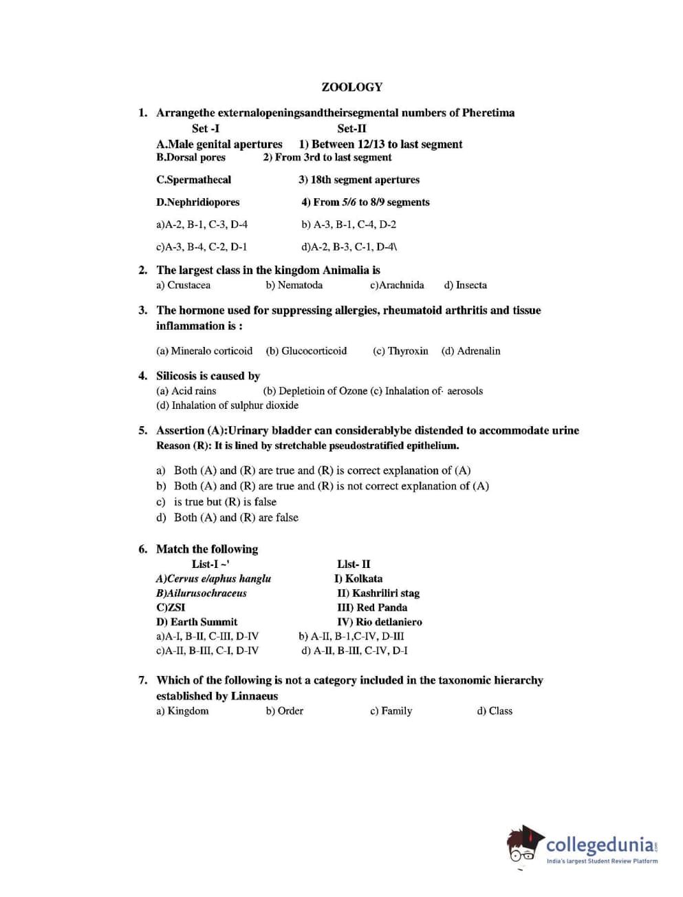 CUEE 2016 B-SC AG. ZOOLOGY SET 4 Question Paper with Answer Key PDFs