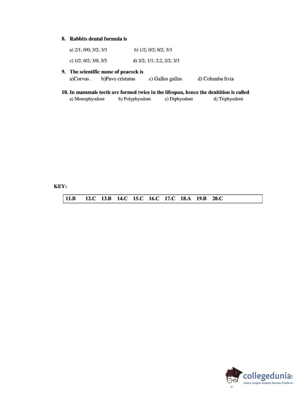 CUEE 2016 B-SC AG. ZOOLOGY SET 4 Question paper with answer key pdf is available for download. The exam was successfully organized by Chhattisgarh Professional Examination Board. The question paper comprised a total of 20 questions.