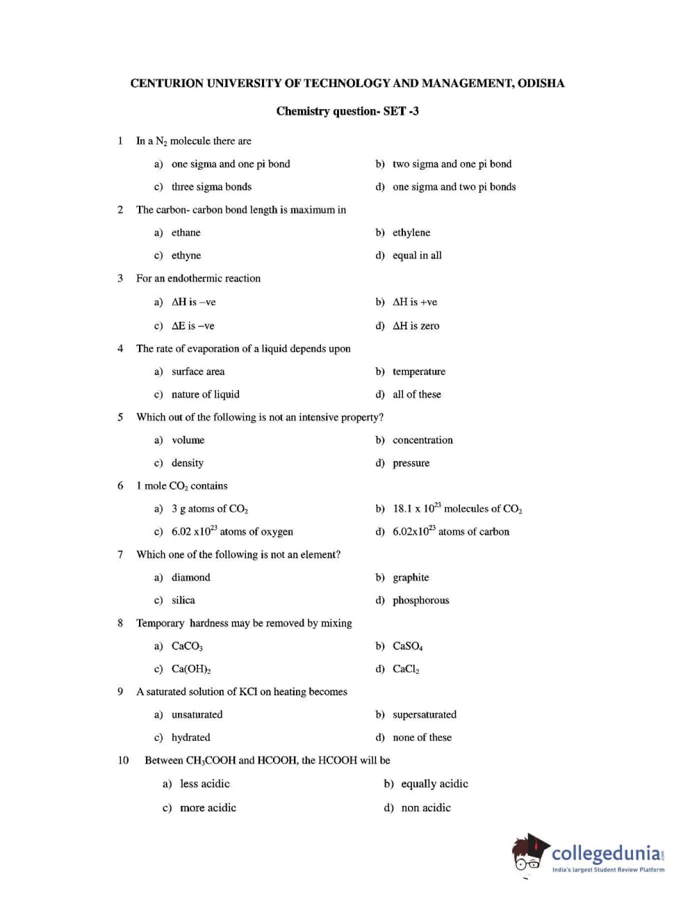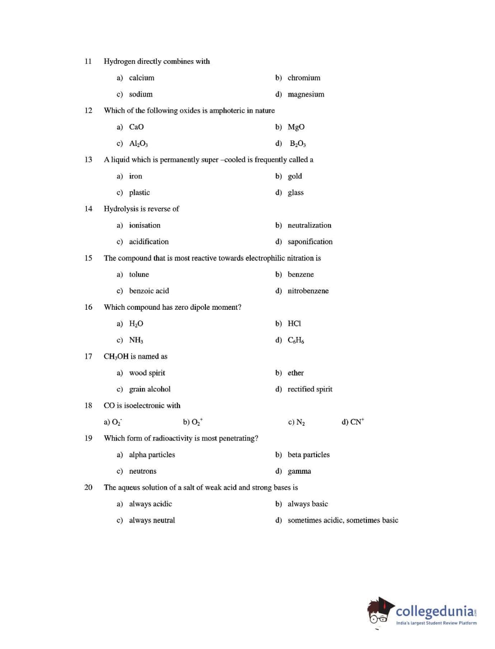CUEE 2016 B.TECH CHEMISTRY SET-3 Question paper with answer key pdf is available for download. The exam was successfully organized by Chhattisgarh Professional Examination Board. The question paper comprised a total of 20 questions.